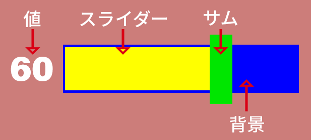また、サブメニューコンテナの子として配置され、かつ特定のアクションが指定されている場合、ユーザーがサム(つまみ)を動かすのに応じて「値」が変わるようなスライダーも作ることができます。