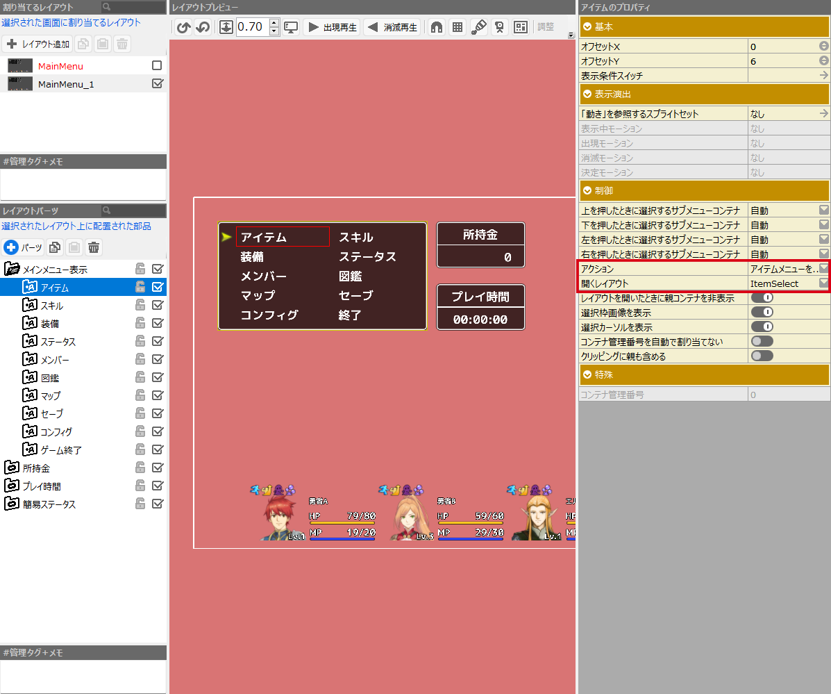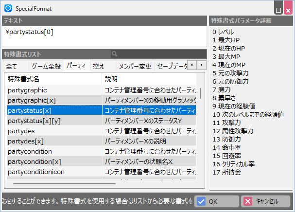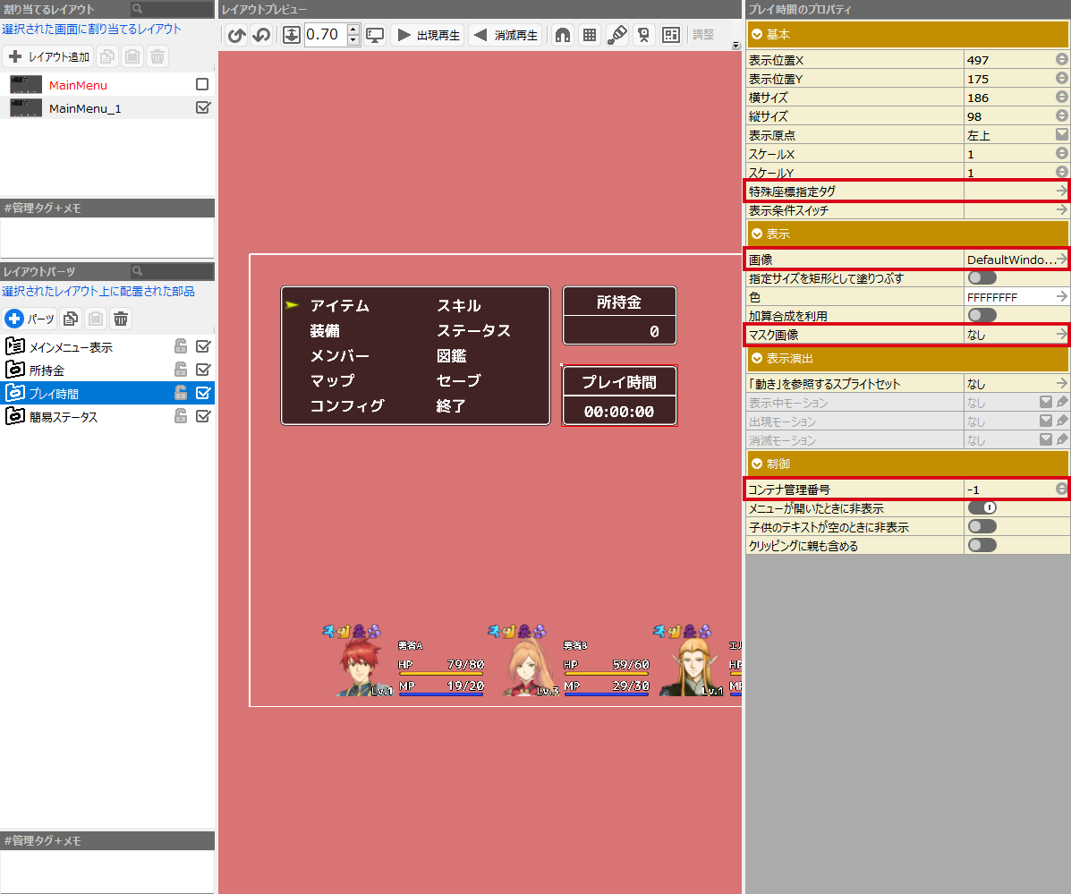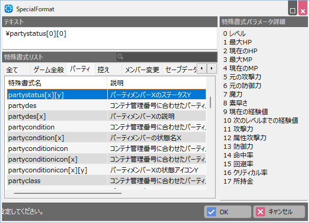 例えばキャストのHP値、アイテムリストに並ぶアイテム名、ステータス画面のキャストのアイコン画像などはテキストパネルに特殊書式を指定することで表示します。