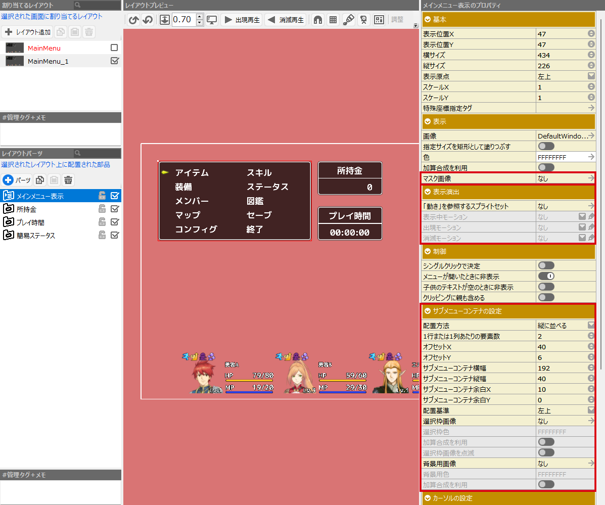 特にタイトル画面、メニュー画面・コンフィグ画面・バトルステータス画面はさまざまなパーツの使い方の参考になると思います。
