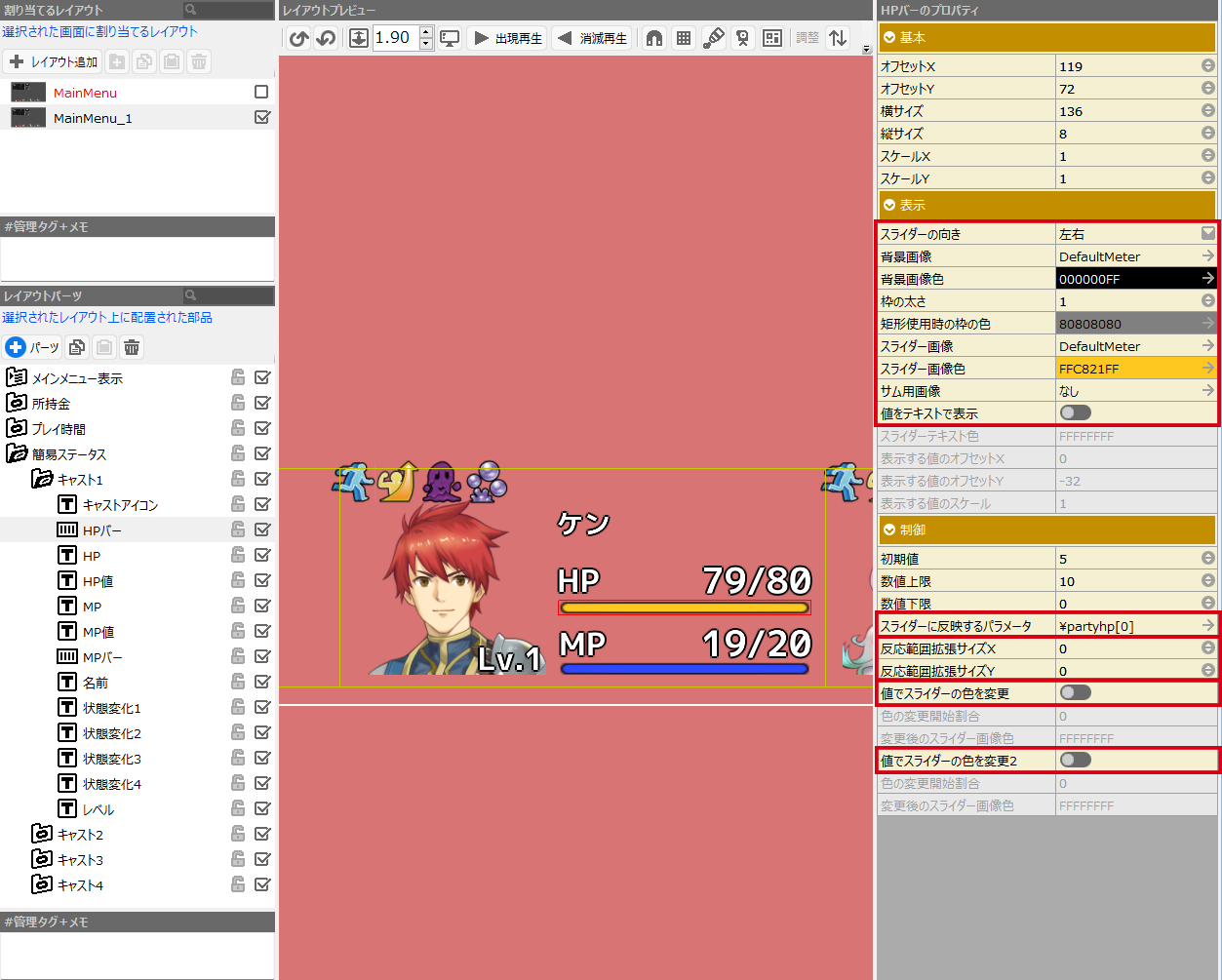 「HPバー:青枠」はスライダーパネルを使って現在のHP値をゲージの形で表示しています。