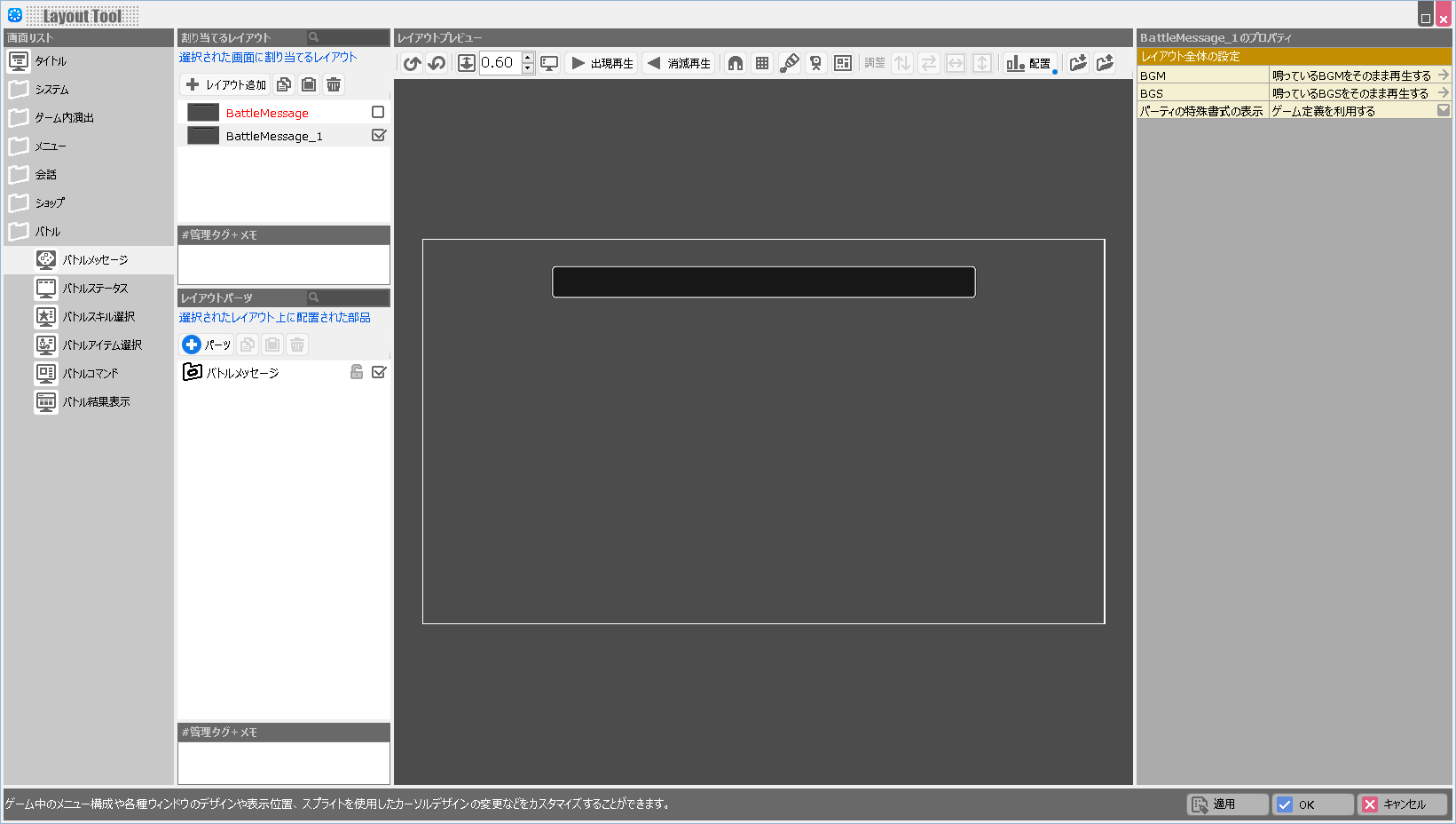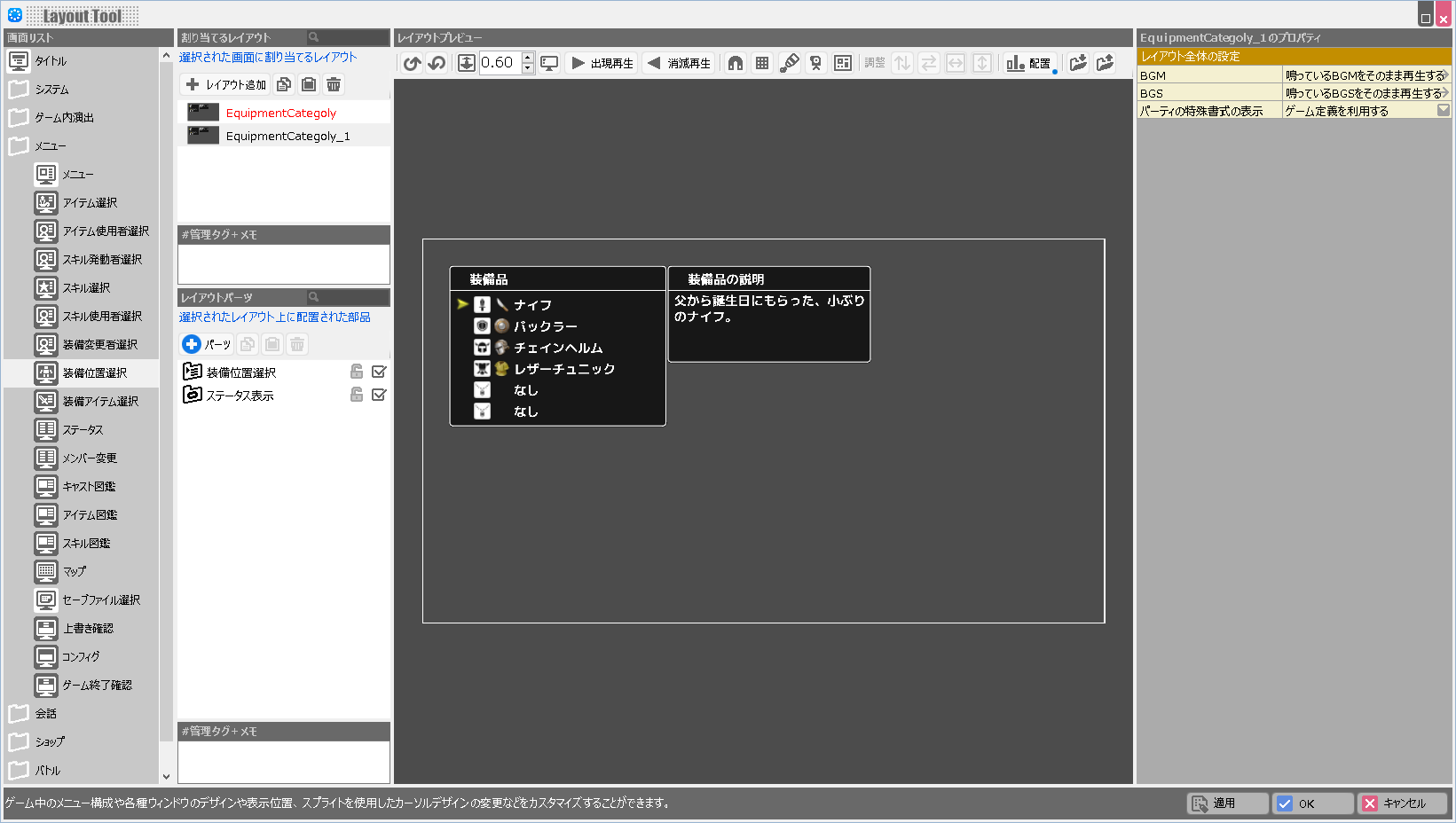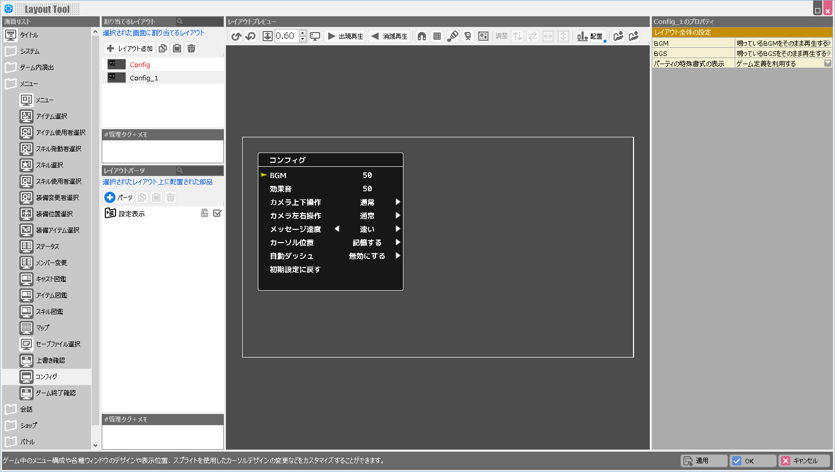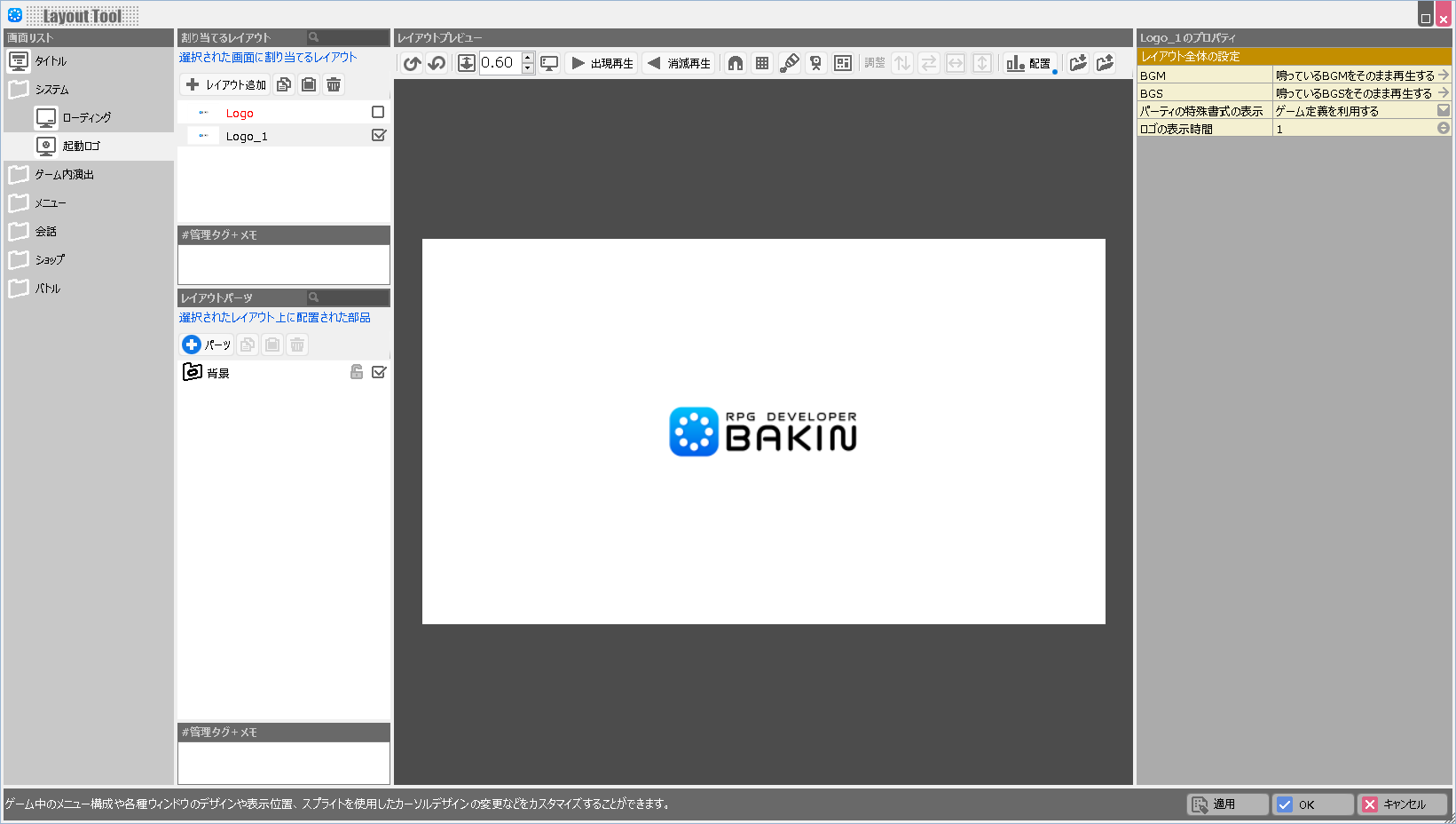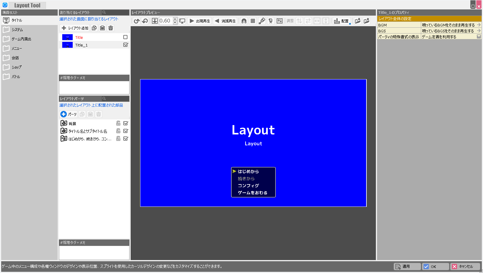 | BGM | このレイアウトが表示されている際に鳴らすBGMを設定します。 |