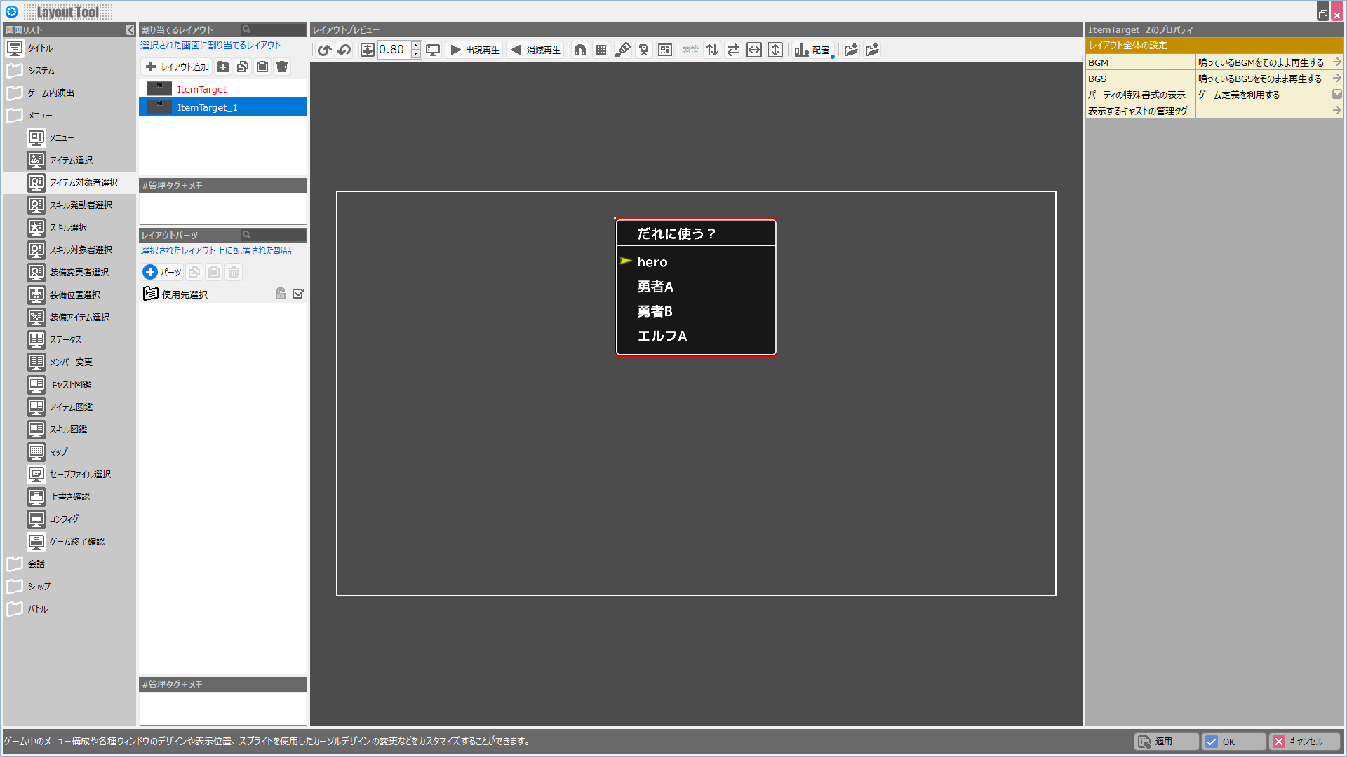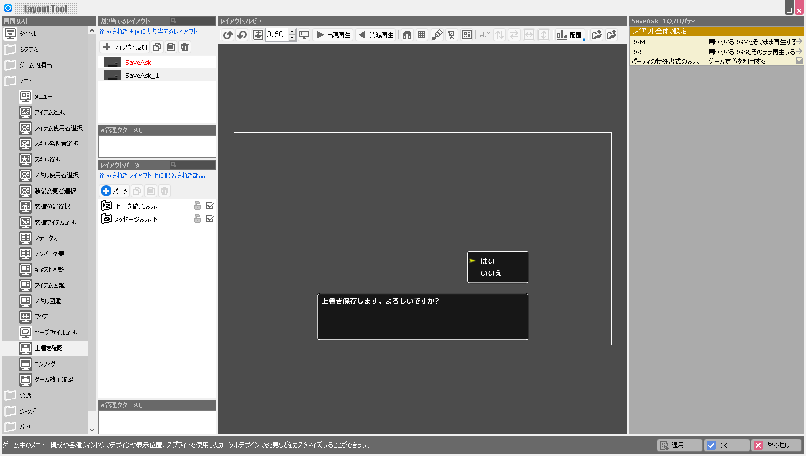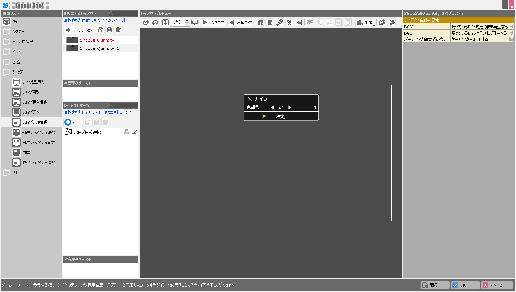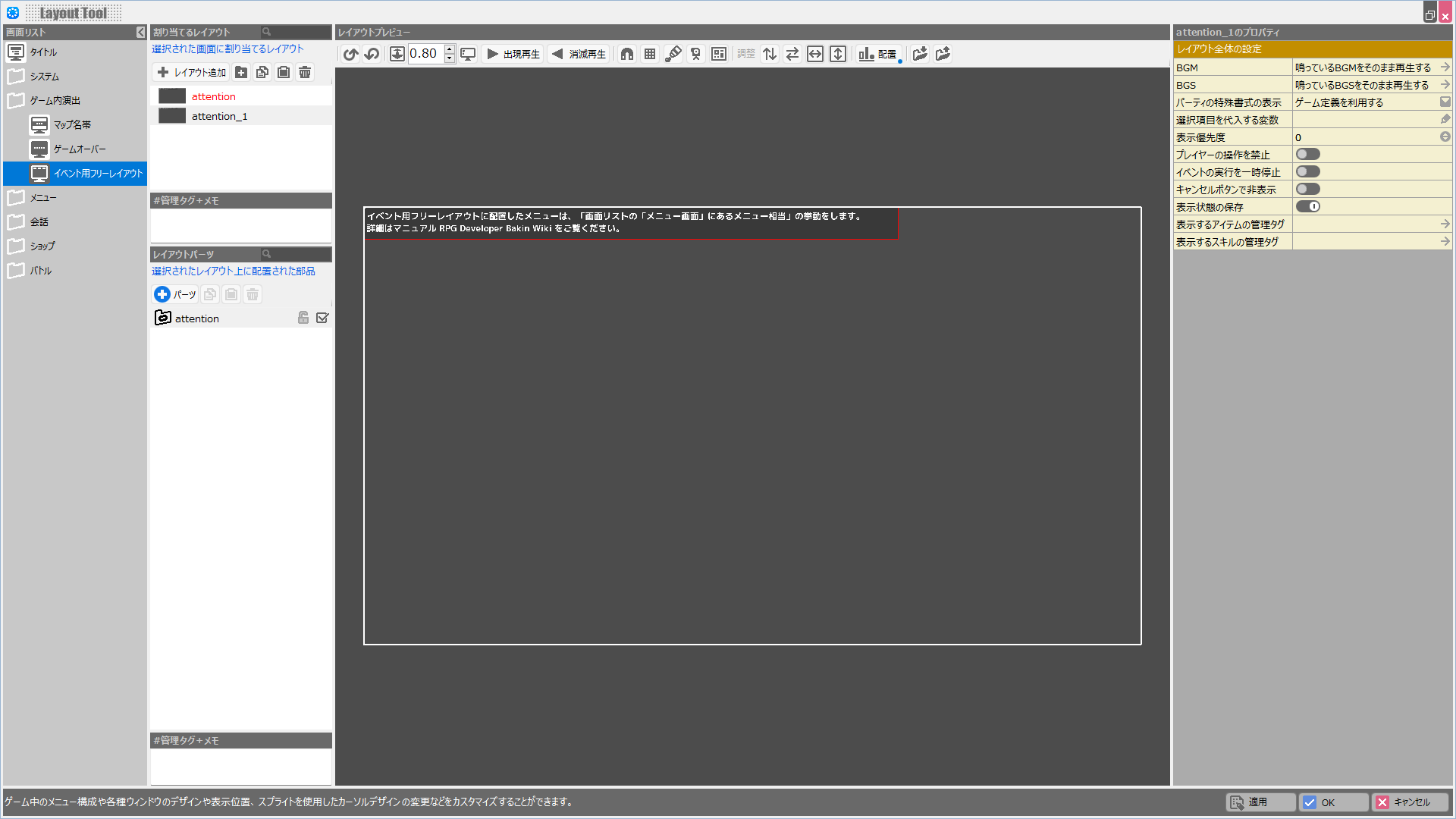| BGM | このレイアウトが表示されている際に鳴らすBGMを設定します。 |