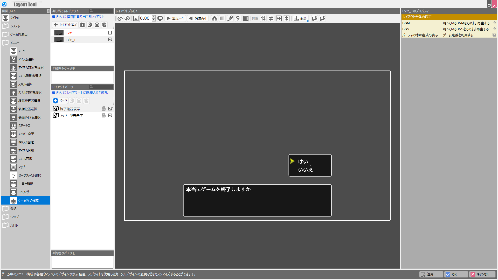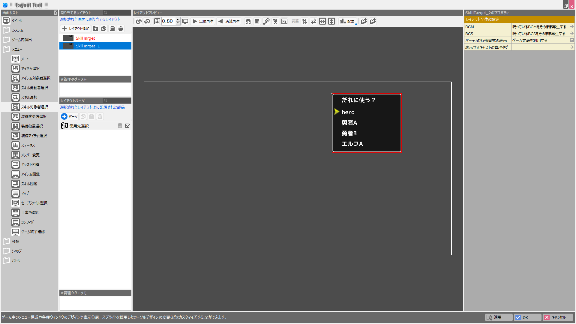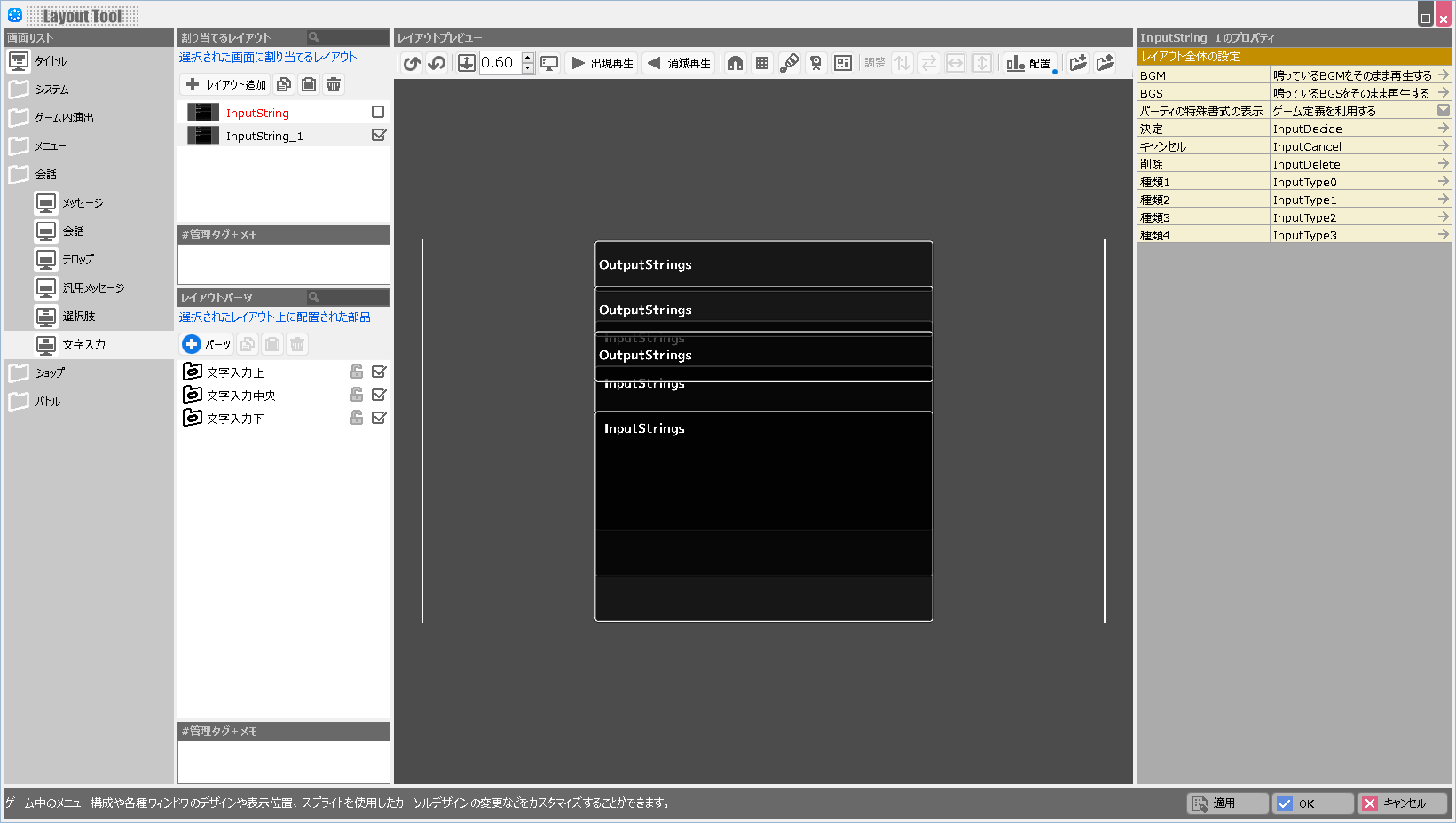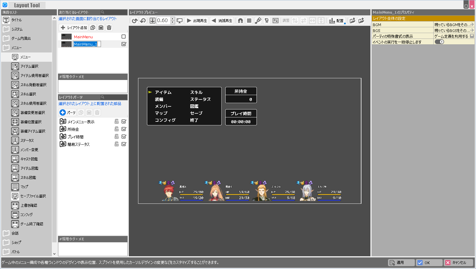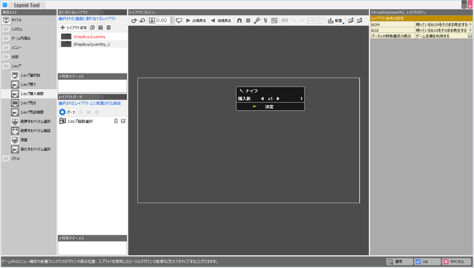 | BGM | このレイアウトが表示されている際に鳴らすBGMを設定します。 |