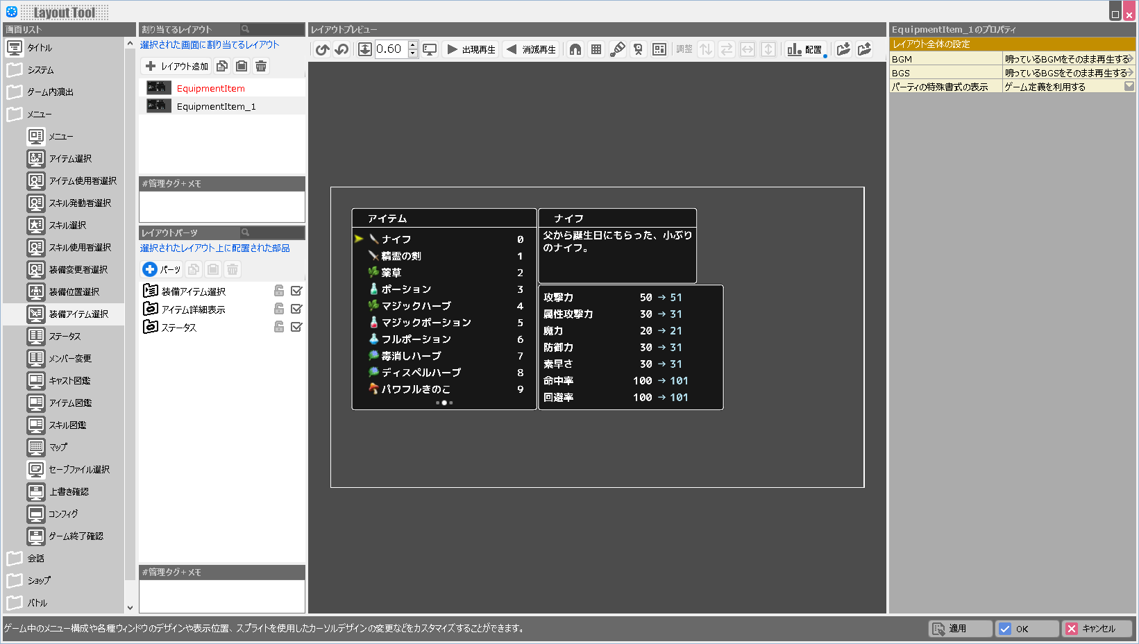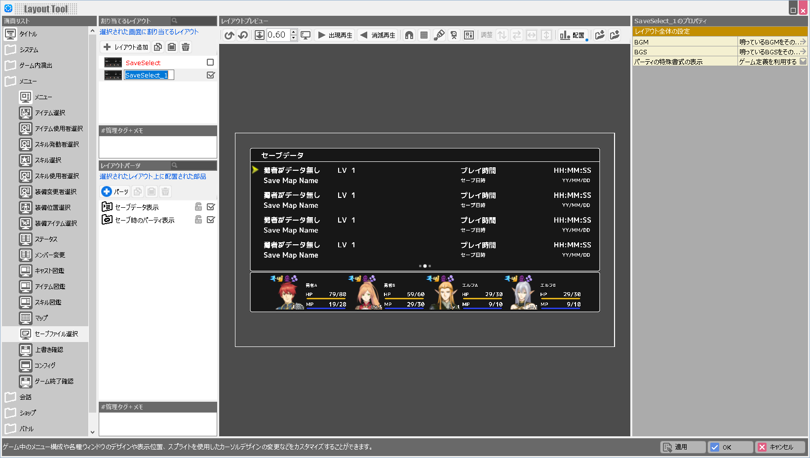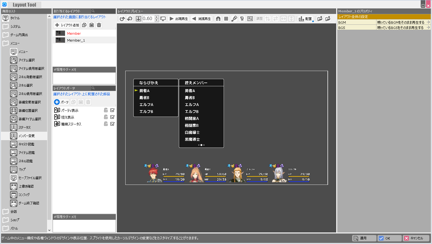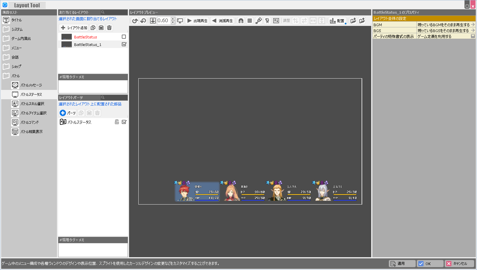 | BGM | このレイアウトが表示されている際に鳴らすBGMを設定します。 |