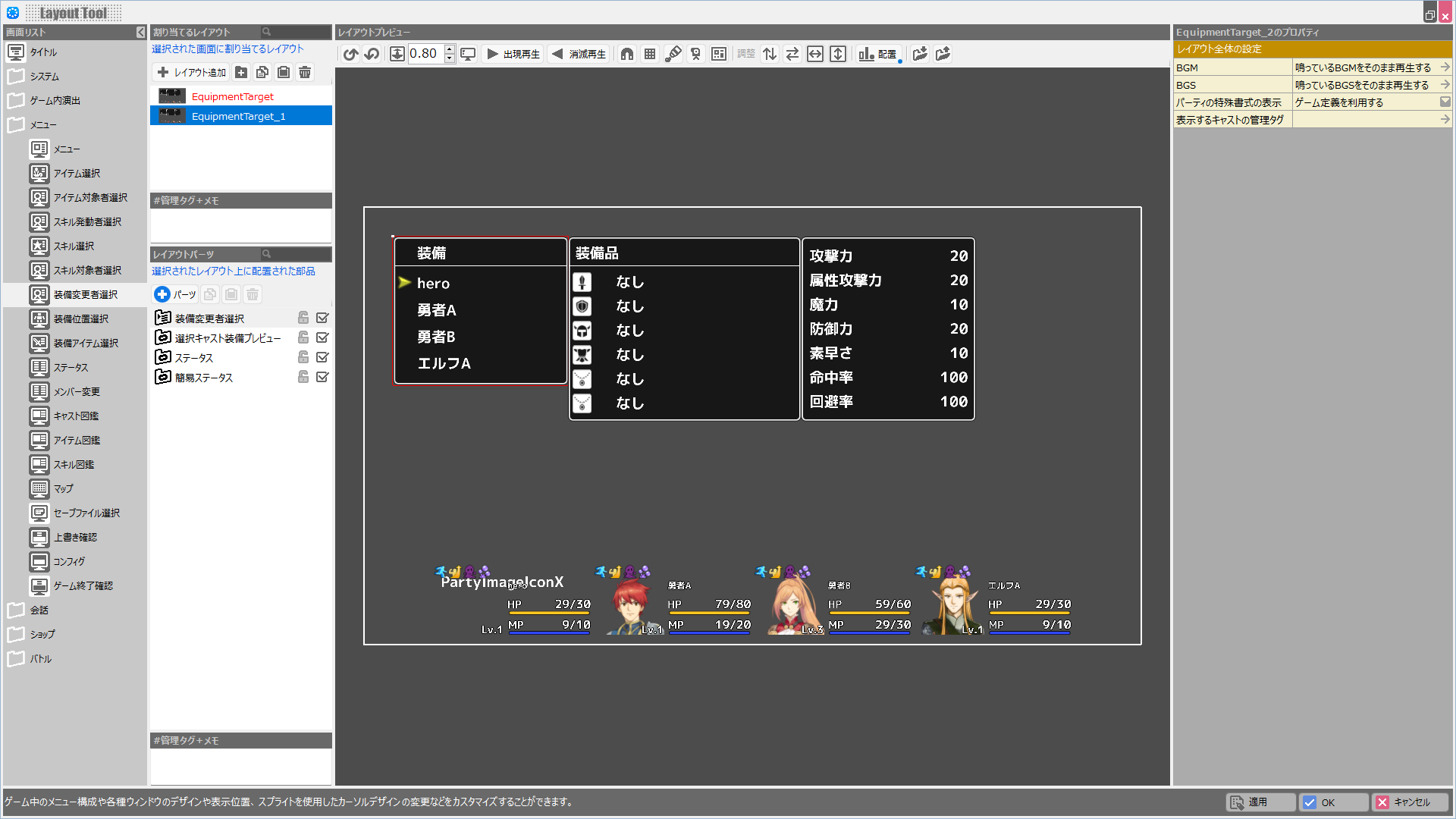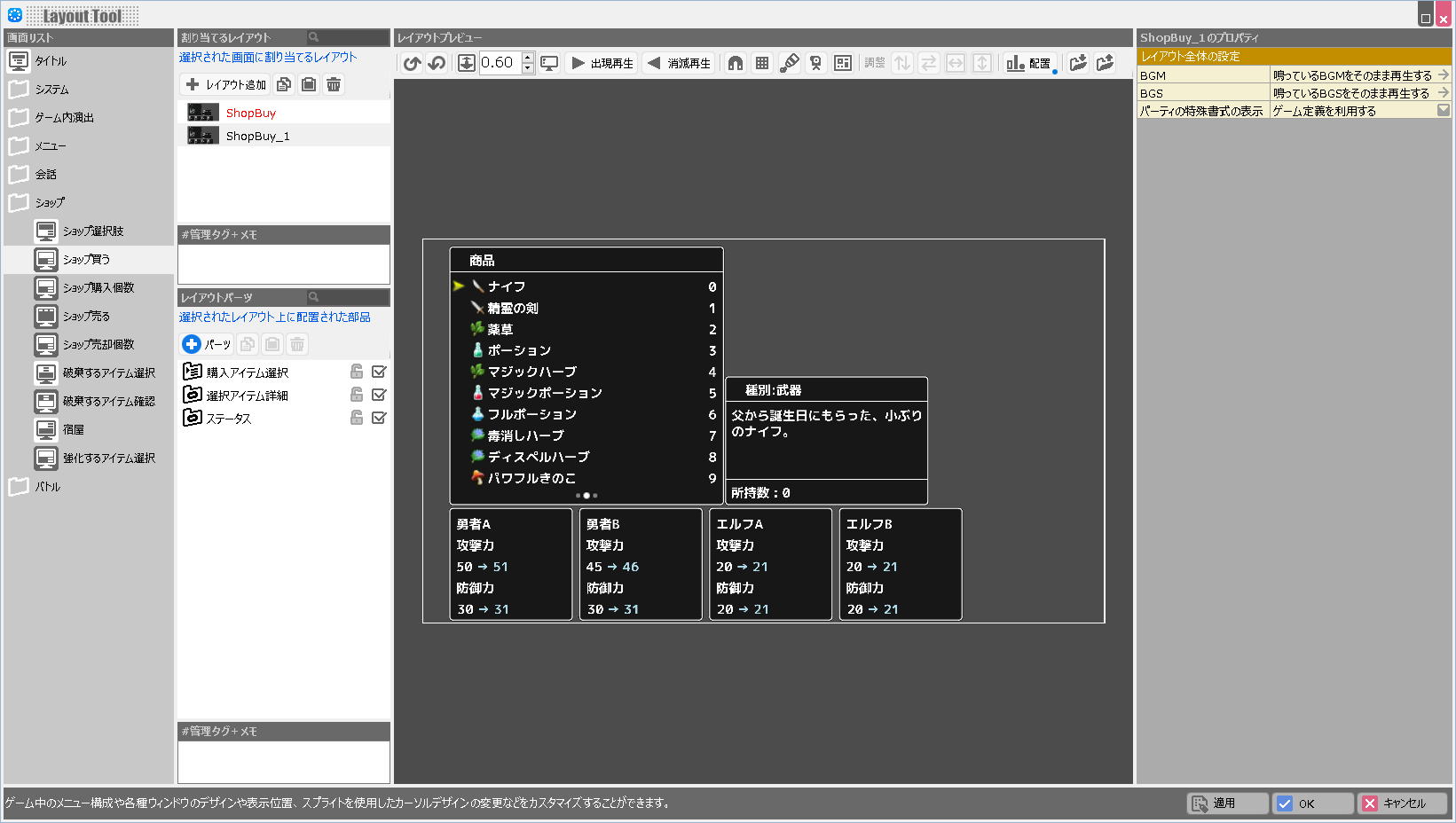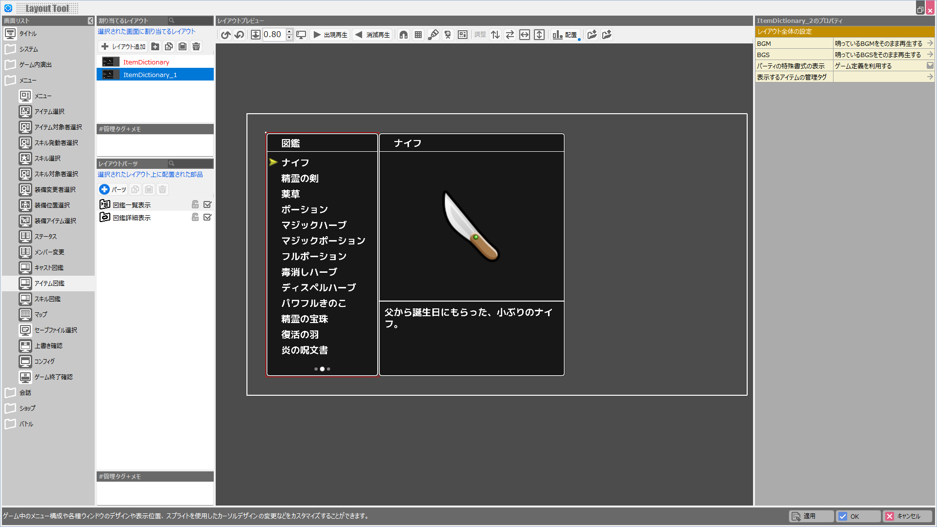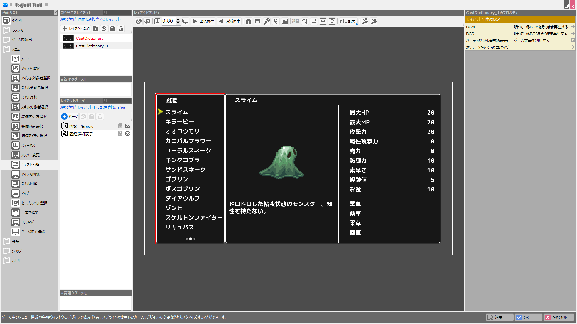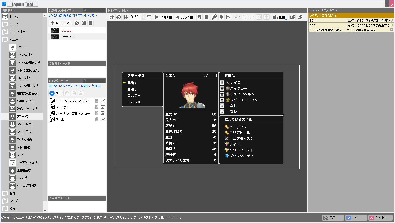 | BGM | このレイアウトが表示されている際に鳴らすBGMを設定します。 |
