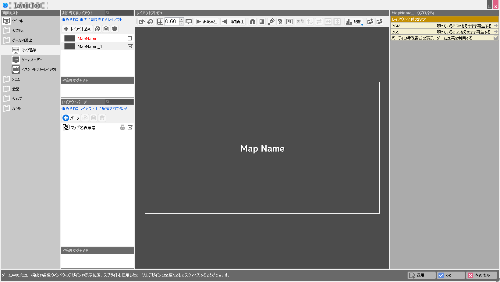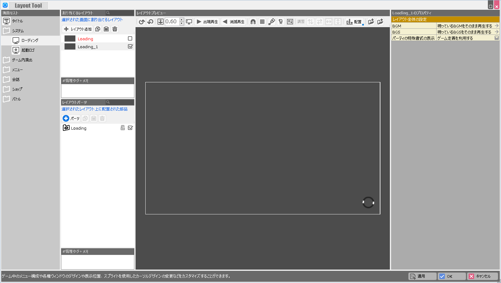 複数レイアウトを作っておけば、Aマップ→Bマップへ行くときとBマップ→Cマップへ行くときにローディング画面を変える、といったこともできます。