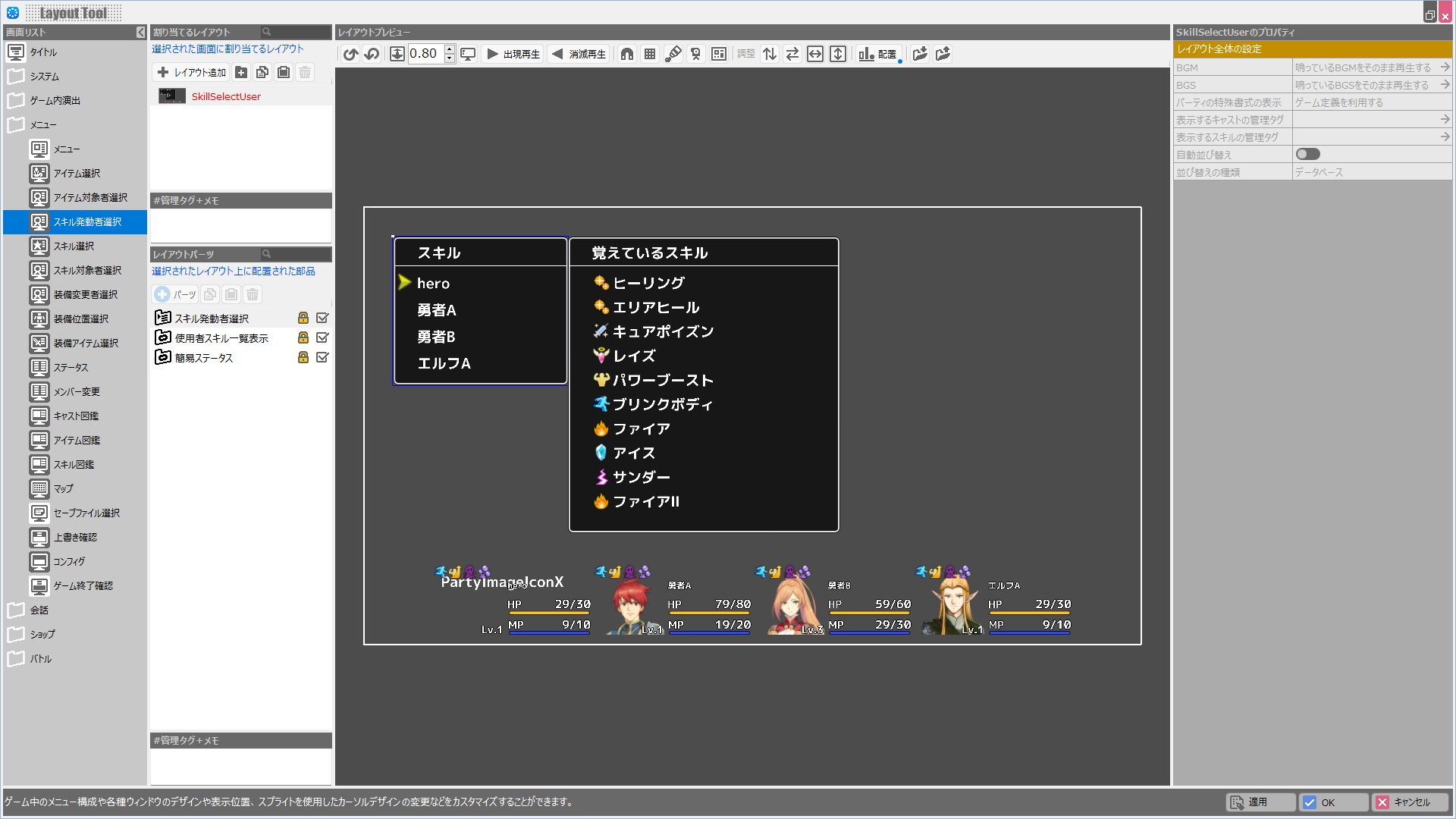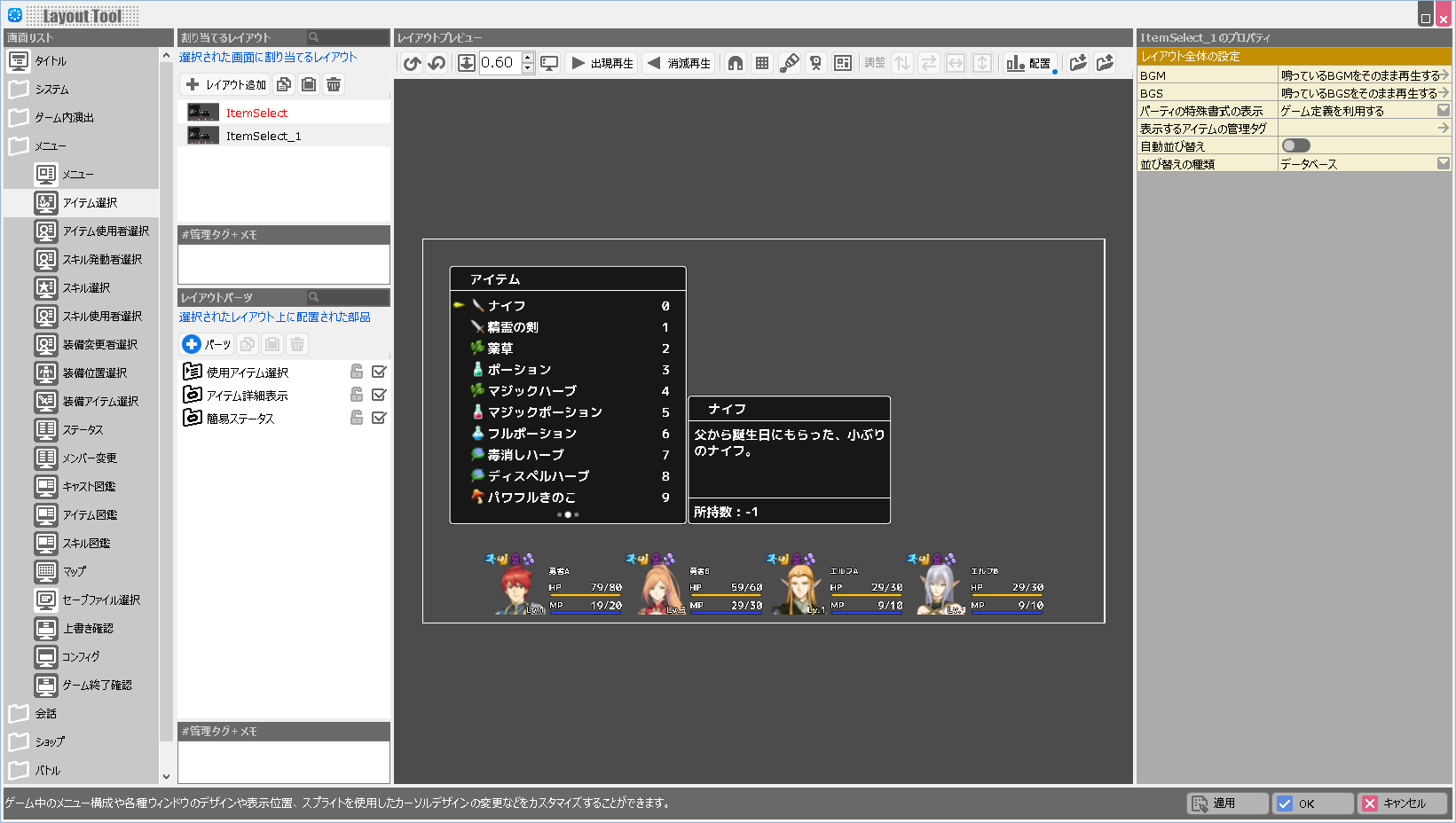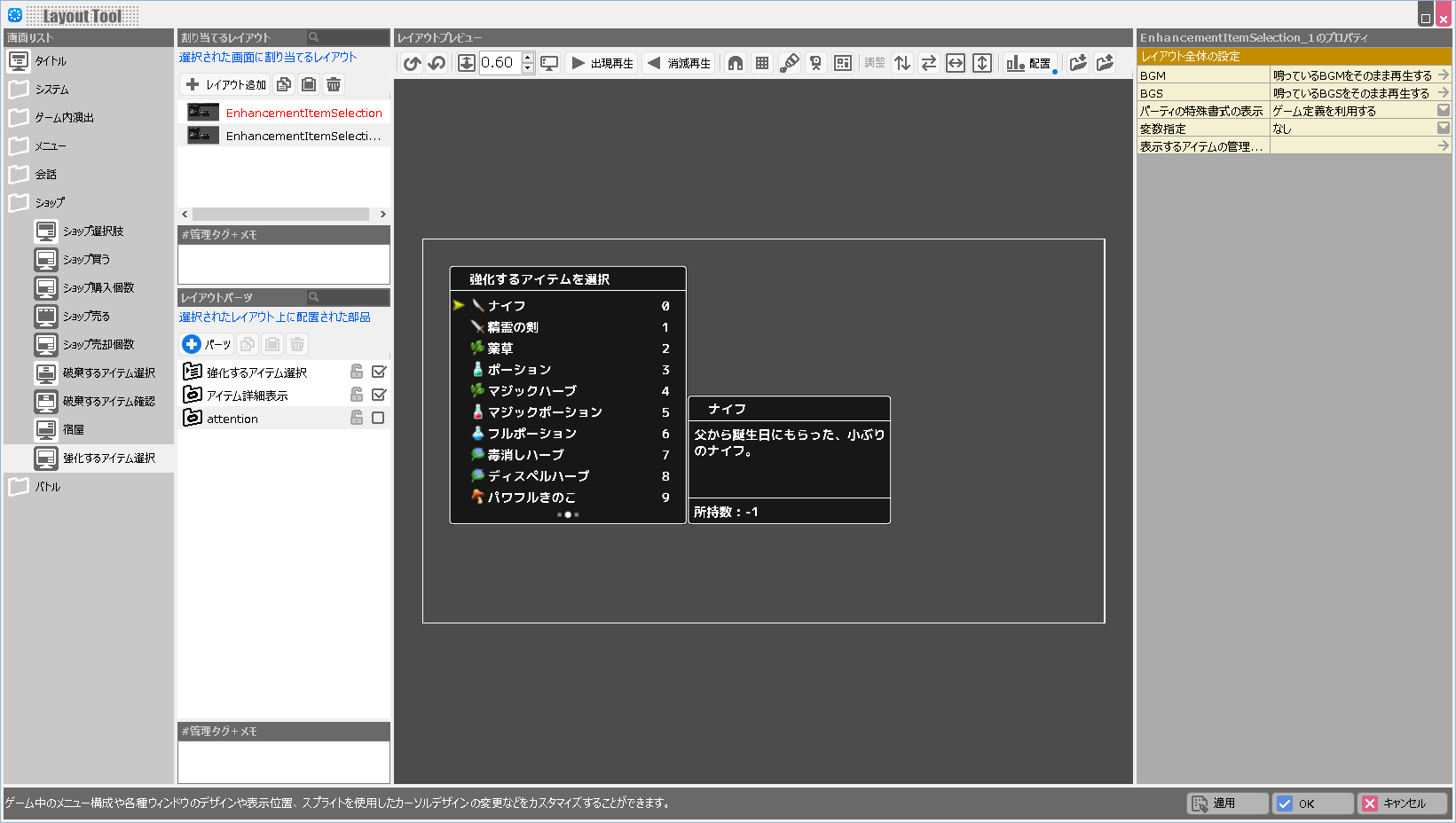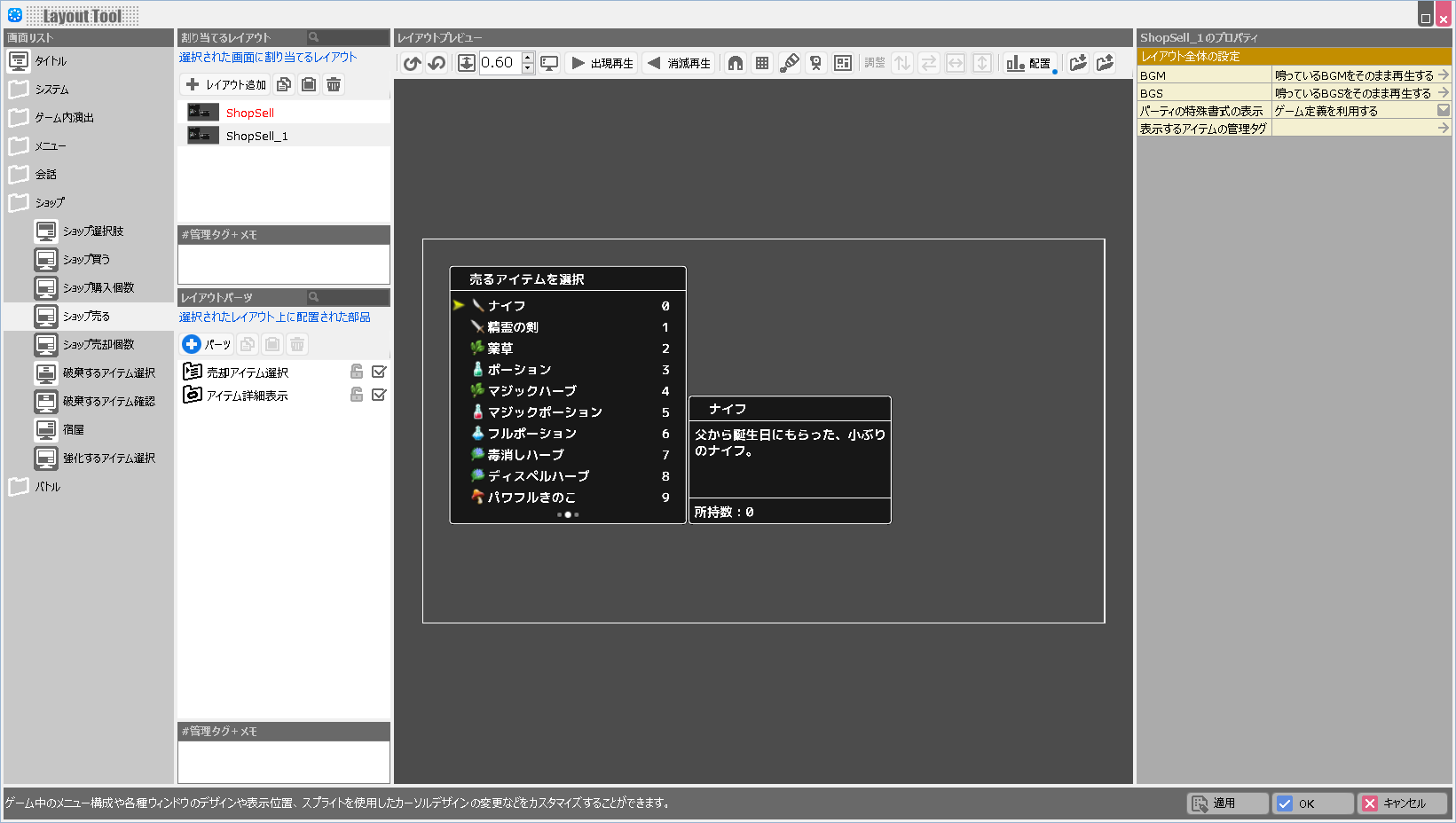 (解説)レイアウトツールでは各画面の持つ固有の役割は変更できません。