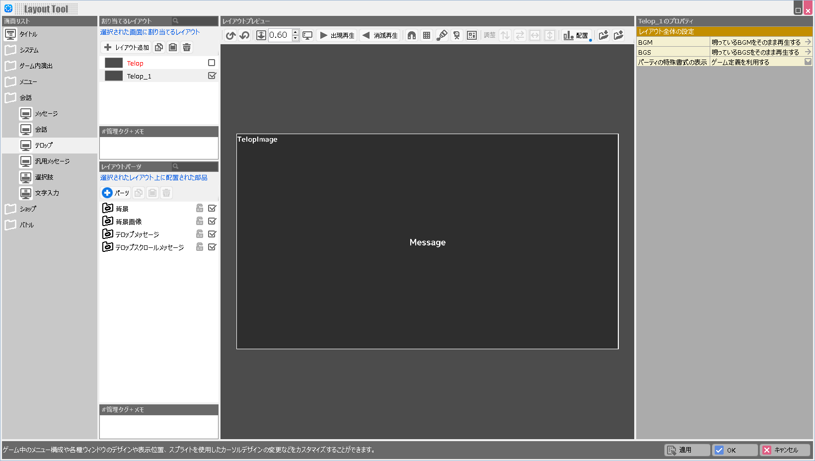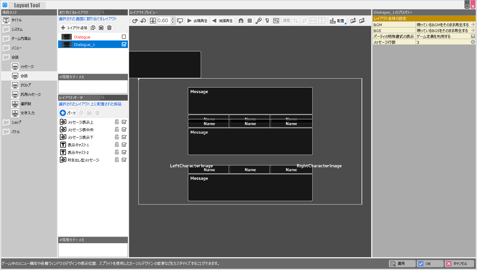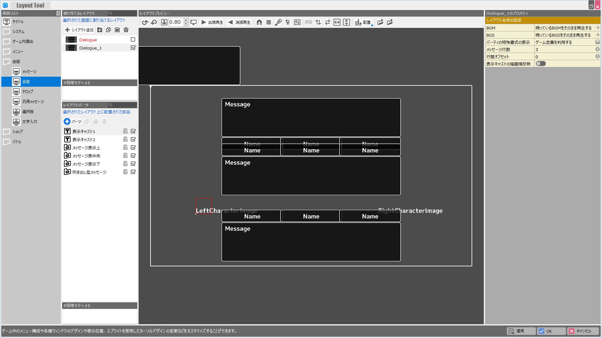 | 表示キャストの描画順反映 | オンにすると、他の画面と同様にレイアウトパーツリストの下のほうにあるパーツが手前に表示されます。 オフにすると、「特殊書式\dialoguecharacterleftまたは\dialoguecharacterrightを指定したパネル」は必ずメッセージウィンドウより奥に描画されます。 |