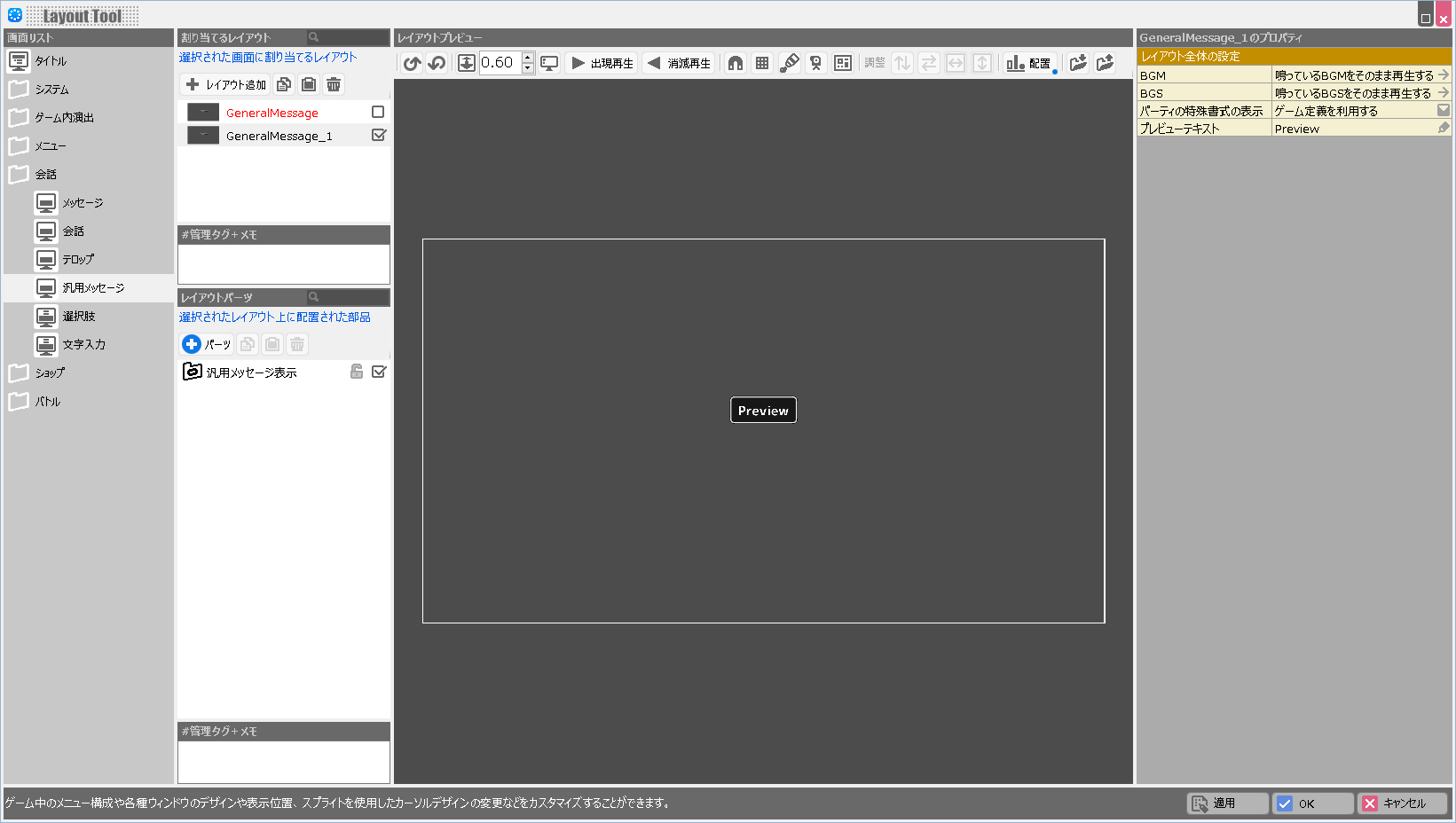 | 表示するウィンドウ位置 | レイアウトプレビュー用の設定です。 プレビューテキスト及び選択肢の行数が指定されている時、指定した位置のメニューコンテナをプレビューに表示します。 メニューコンテナの特殊座標指定タグに、表示位置を示すタグを設定しておく必要があります。 |