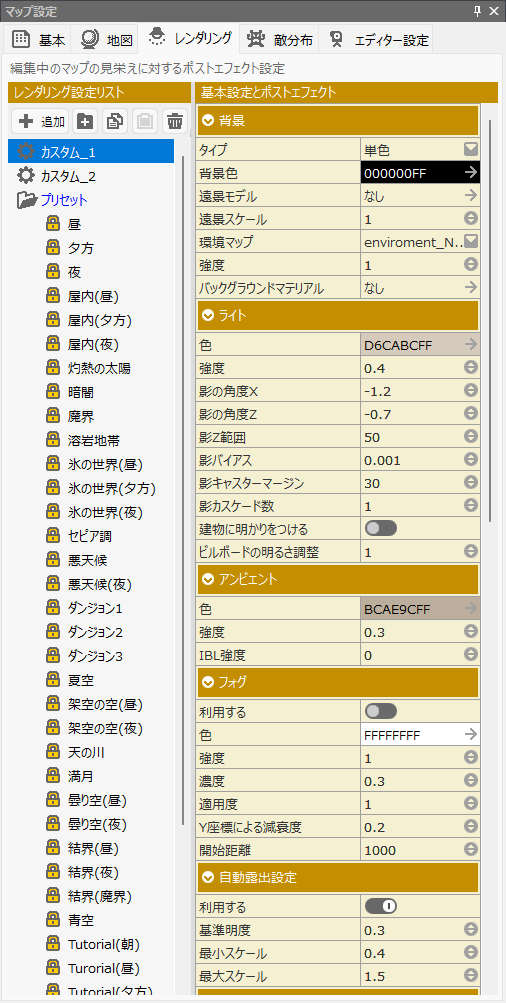 マップの見栄えをより良くするための各種ポストエフェクトを設定できます。