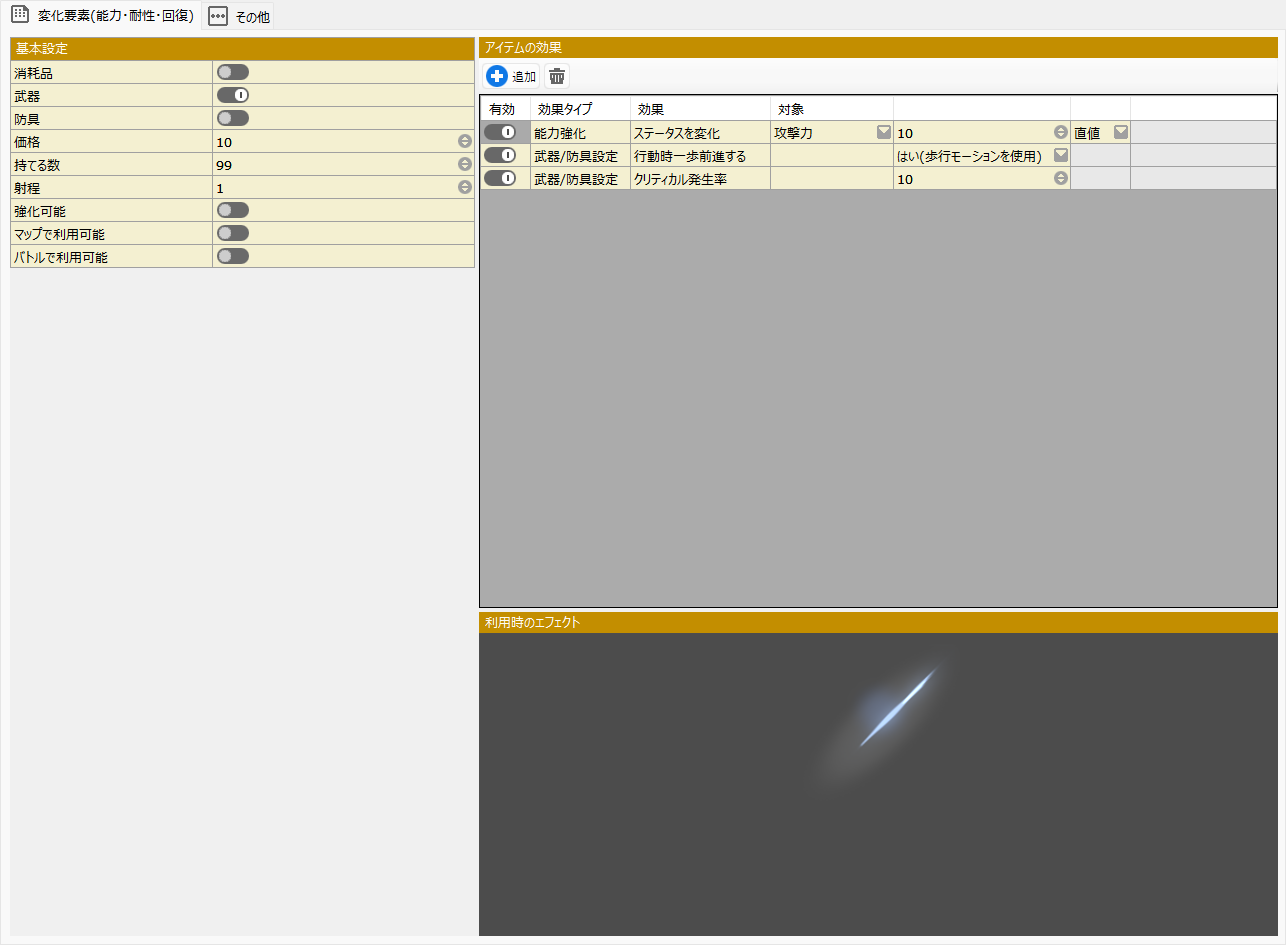 ここでは武器、防具、一度使ってしまうとなくなる消耗品など、ゲーム中にキャストが使用するアイテムのデータを作成します。各アイテムにはステータスや能力変化を個別に設定できるほか、スキルの能力を割り当てたり、共通イベントを設定して特殊な動作を設定することもできます。
