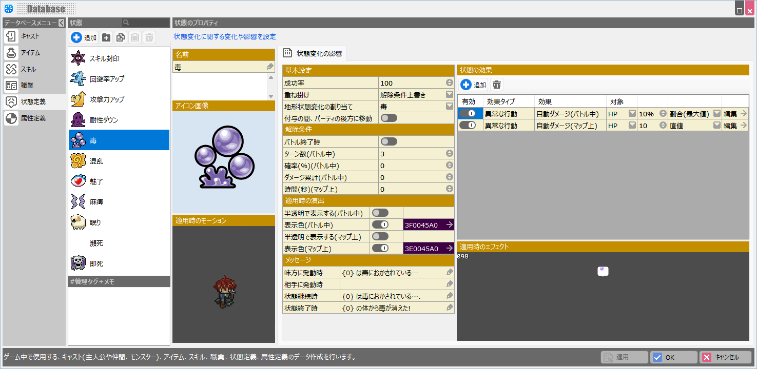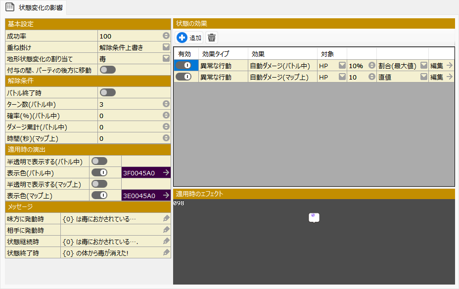 ”状態”に変化する確率や”状態”の効果が解除される条件など、基本的な情報を設定します。
