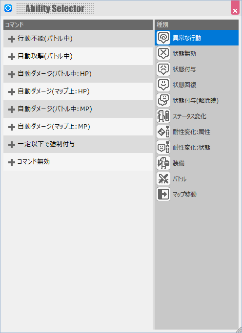 例えば、"毒"状態の効果として「状態変化(付与時) - 付与あり - "猛毒"」を指定し、"毒"状態になっているキャストをイベントで"毒"状態にしたとき、合わせて"猛毒"も付与されるようになります。