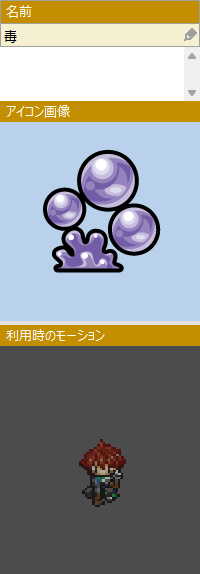 | ダメージパラメータ(バトル) | ダメージ値を指定します。ダメージタイプの設定に応じて、設定した数値を"直値"で扱うか、"割合(%)"として扱うかが変わります。 マイナスの値を設定すると消費値が自動的に回復する効果となります。 |