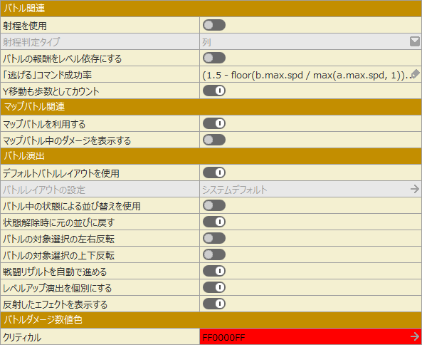 各マップのマップ設定>敵分布においてカスタムバトルレイアウトを設定したり、イベントバトルにおいてバトルレイアウトを指定しない場合は、この項目で設定した内容に従ってバトルが行われます。