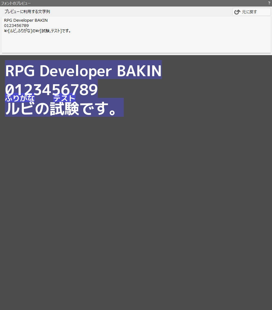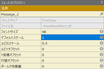 - 表示されるフォントの表示スケールは、リソース>フォントで設定するサイズやスケール、レイアウトのテキストパネルにおける文字スケール、イベントパネルの制御文字によるスケール指定などの影響を受けます。