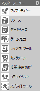 マスターメニューには、ゲームを構成するさまざまな要素を作成、管理、設定するための各種ツールが揃えられています。