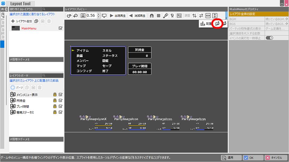 - 割り当てるレイアウト欄にチェックボックスがある画面(画面リストのアイコンが白色)で読み込まれたレイアウトにチェックを入れます。ゲーム内で使用されるレイアウトが切り替わります。