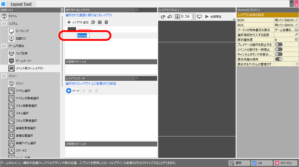 ※レイアウトツール>割り当てるレイアウトを変更することでレイアウトの名前を変更できます。