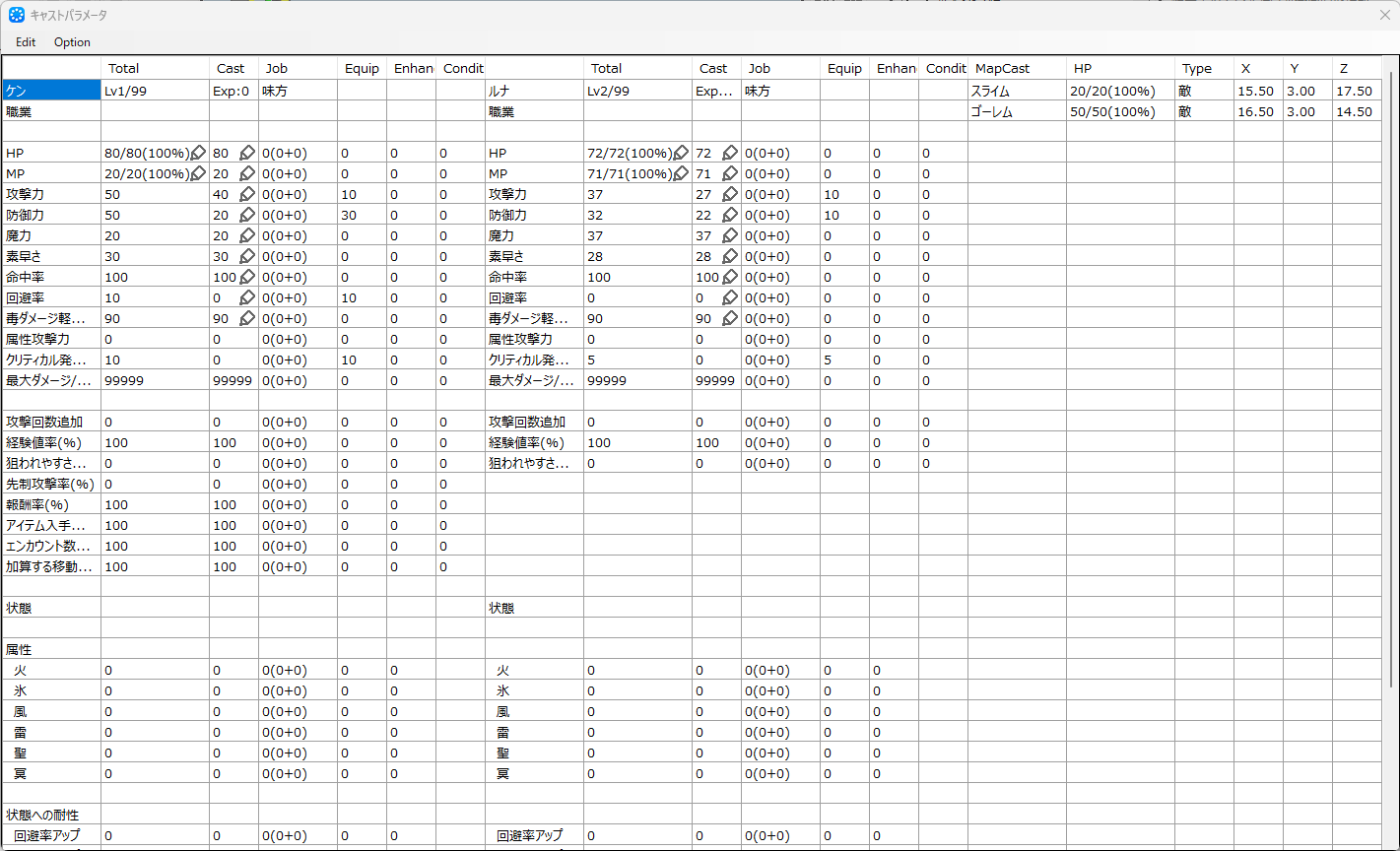 また一部のステータスの値やキャストの保持スキルの情報を一時的に変更することもできます。