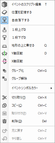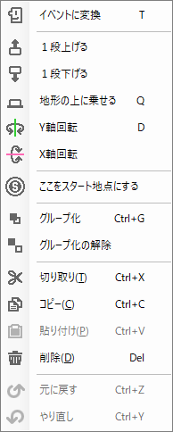 地形、物体、イベントのどれを選択しているかによって表示されるコンテキストメニューの内容が変わります。