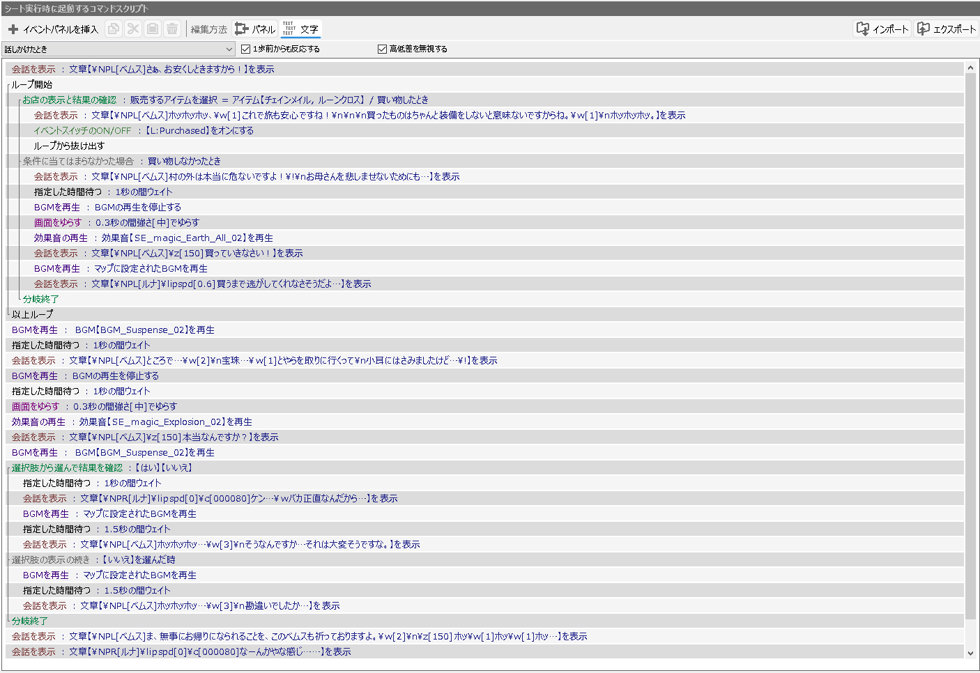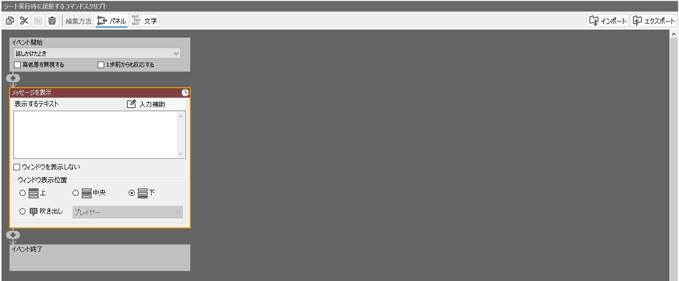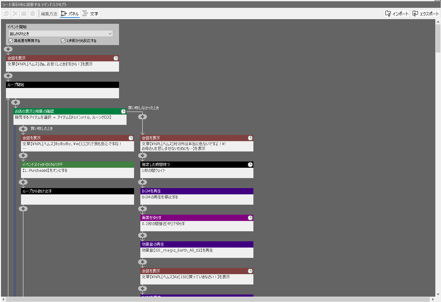 イベントの本体ともいえる、イベントパネルを組み合わせて命令を作成する「コマンドスクリプト」を操作する画面です。