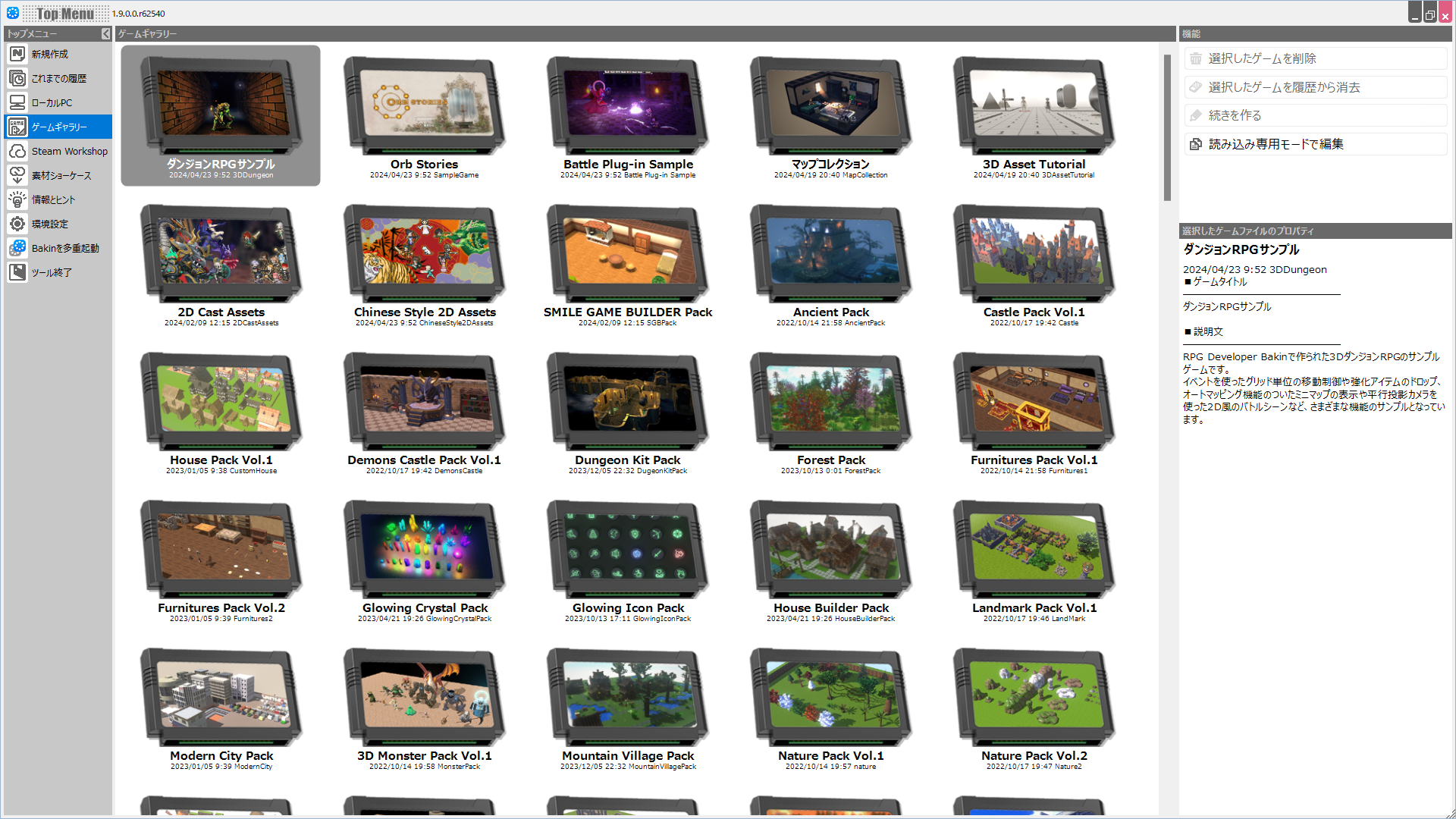 一覧には、サンプルゲームをはじめ、データ集など、あらかじめ用意されているさまざまなゲームファイルが表示されます。