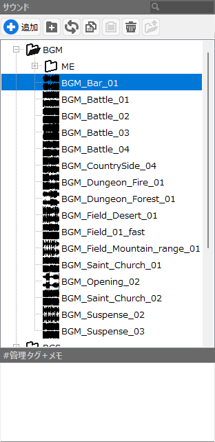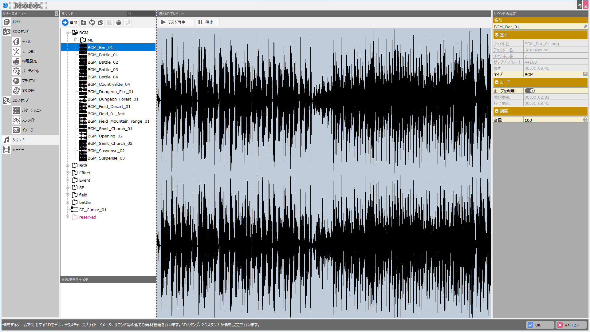 サウンドデータの管理を行います。RPG Developer Bakinで使用可能なサウンドフォーマットは、.ogg,.wavとなります。