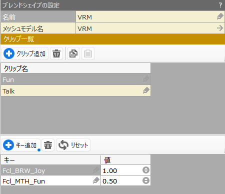 fbxに設定されたシェイプキーをブレンドして”クリップ”を作成できます。