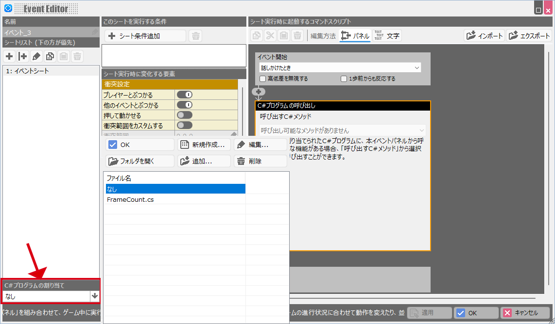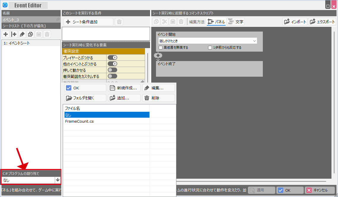- イベントスクリプト イベントにC#プログラムを割り当てることで、イベントの機能を拡張する