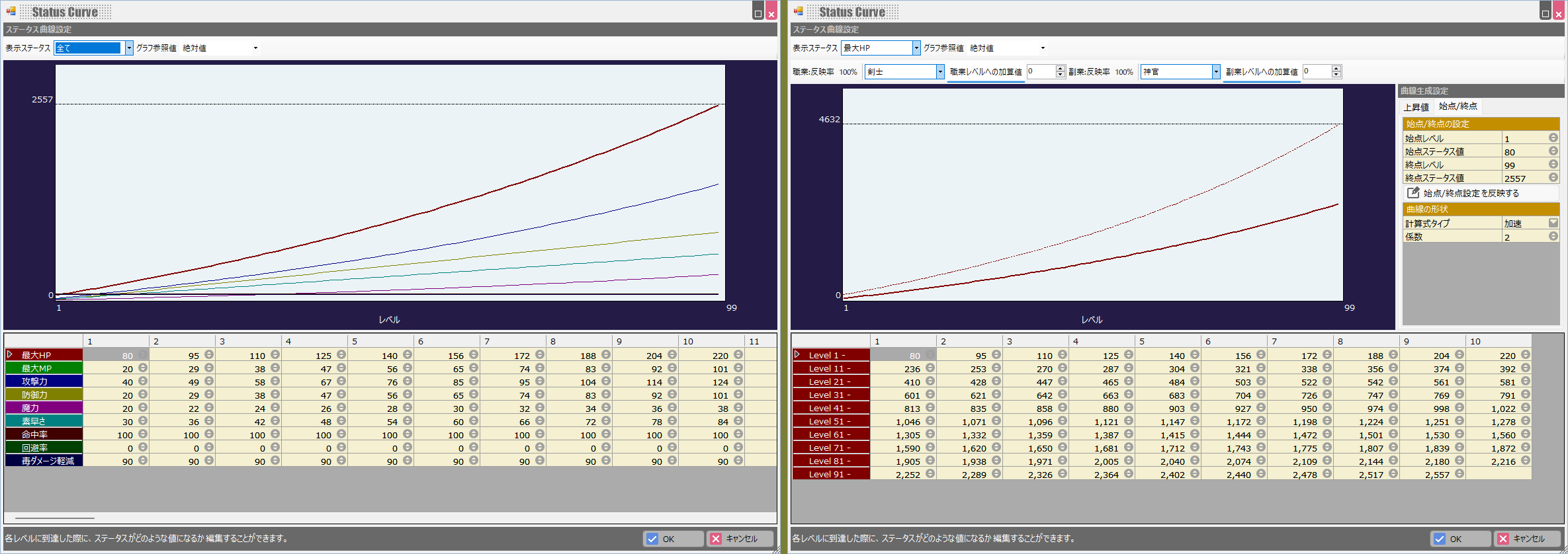 必要経験値の計算式及びプリセットされたデフォルトデータについては経験値によるレベル上昇の計算式の項をご覧ください。