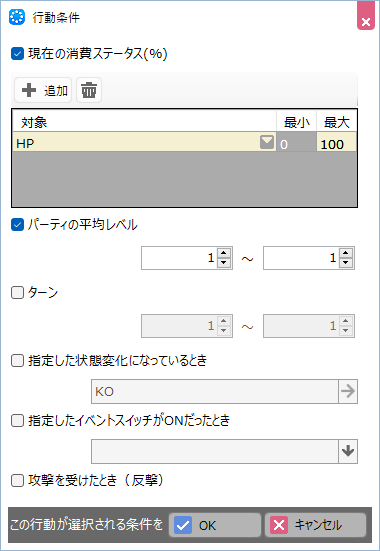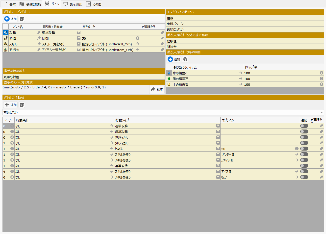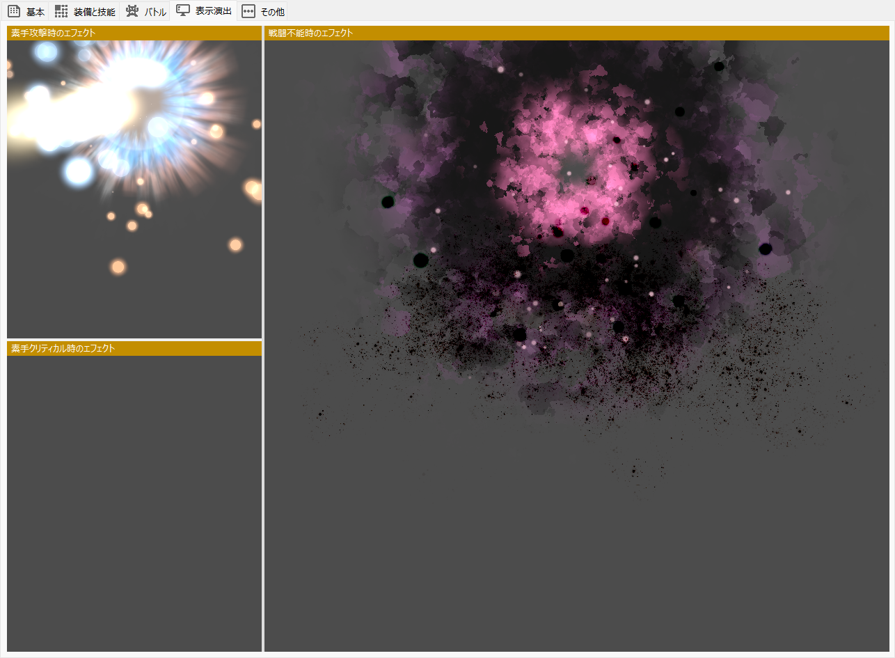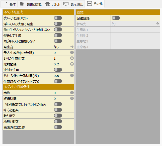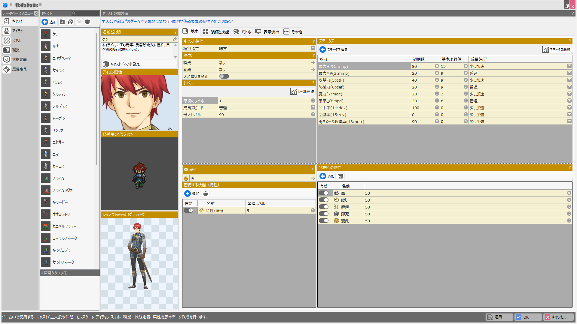 このダイアログで変更した結果は、他のデータベースの項目(アイテム/スキル/職業/状態定義)、レイアウトデータ、イベントなどゲーム全体に影響を及ぼすことに留意してください。
