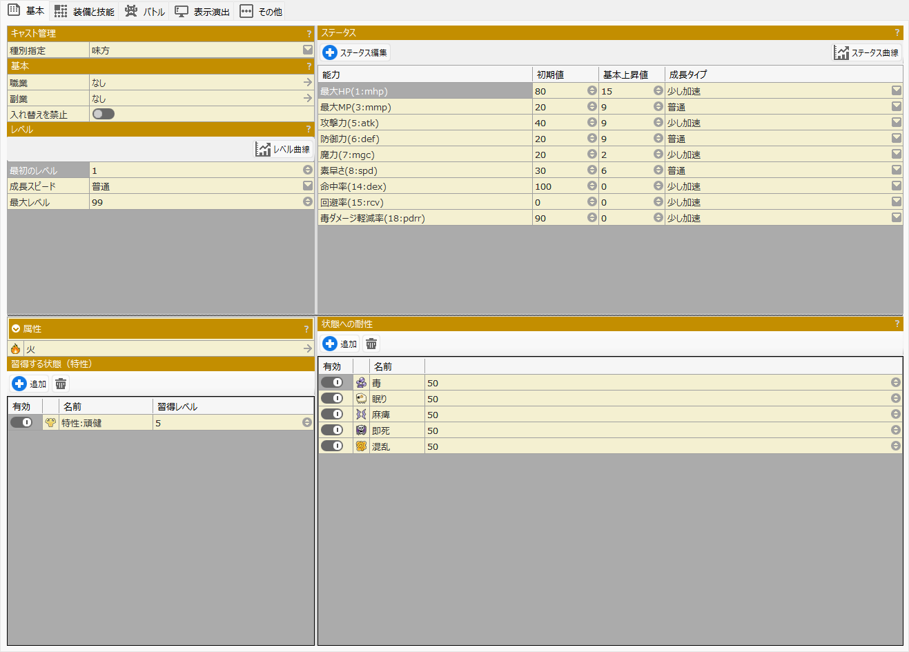 状態変化に対する耐性(状態になる確率の増減値)を設定できます。