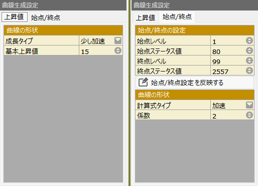 ステータス曲線ダイアログでプリセットデータを変更するとこの欄には「カスタム」と表示されます。