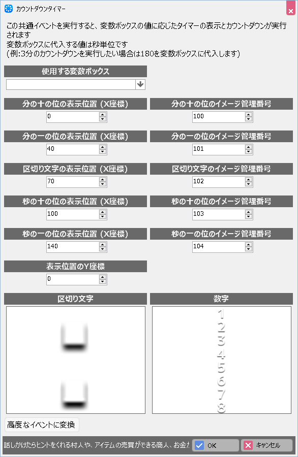 時間表示の数字や区切り文字のイメージ管理番号をそれぞれ設定します。