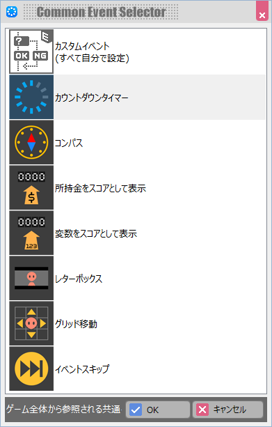 マップには配置されず、ゲーム全体を通して利用するイベントの設定を行います。