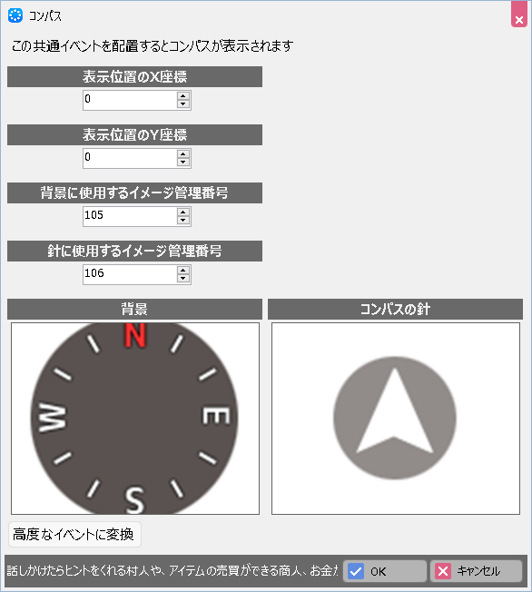 この共通イベントを配置すると、ゲーム内でコンパス(方位計)が表示されます。