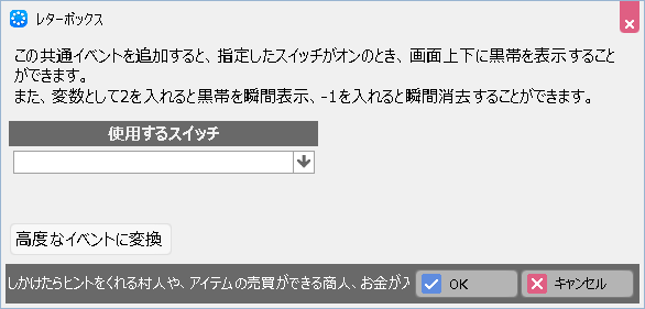 この共通イベントを設定すると、指定したスイッチがオンの時に、ゲーム画面の上下に黒い帯を表示することができます。