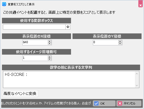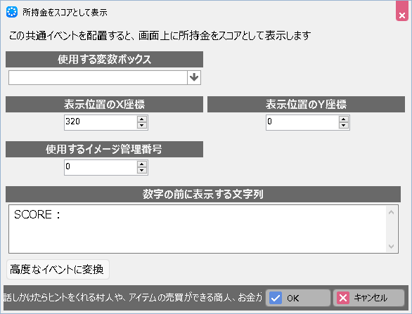 この共通イベントを配置すると、ゲーム画面上に特定の変数がスコアとして表示されます。