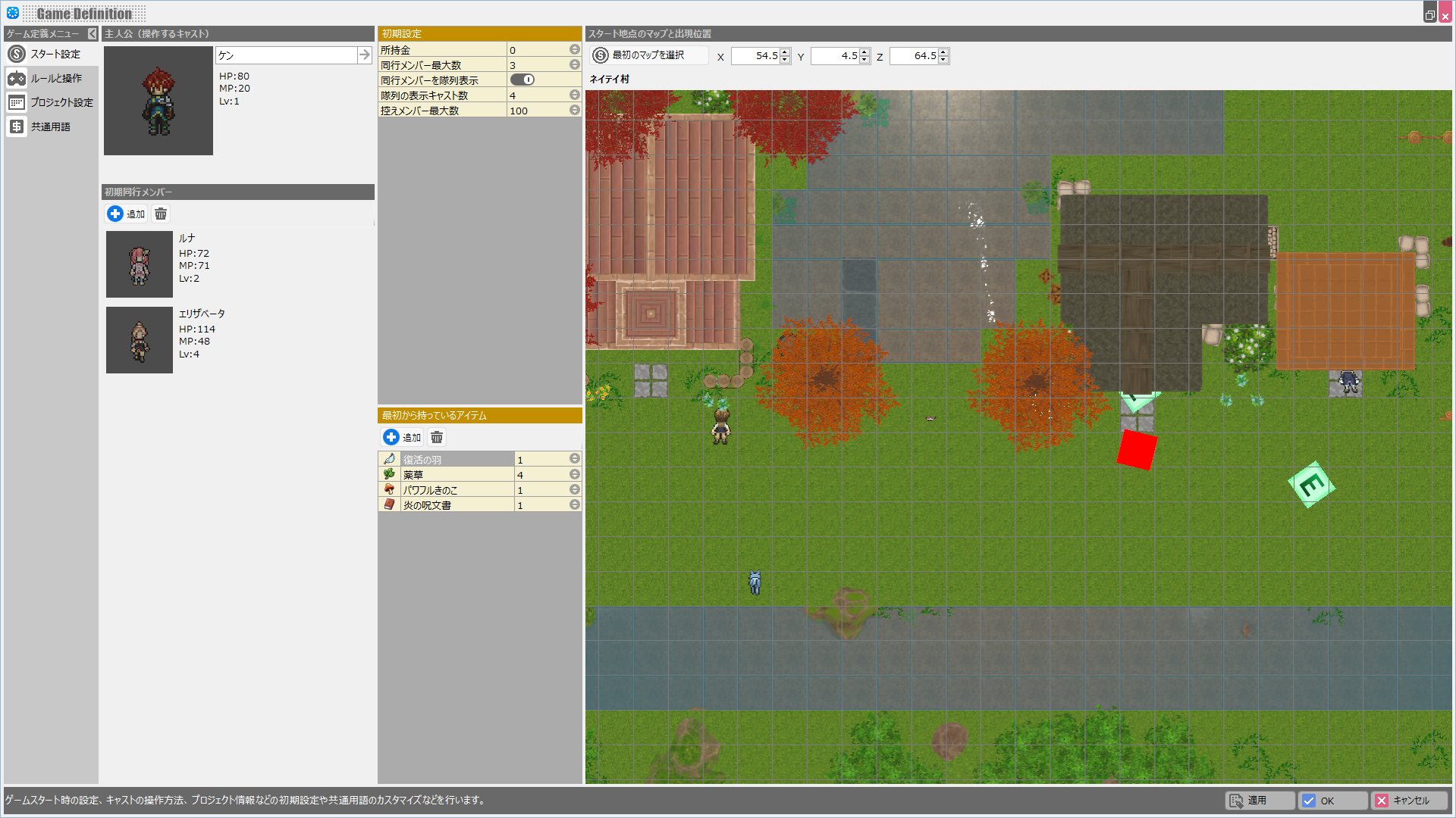 ゲーム開始に操作するキャスト、同行メンバー、所持金、最大同行メンバー数、スタート地点などを設定します。