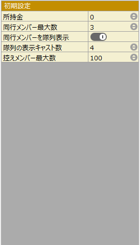 ゲーム開始時の所持金や、同行するキャストの最大数や表示方法について設定します。