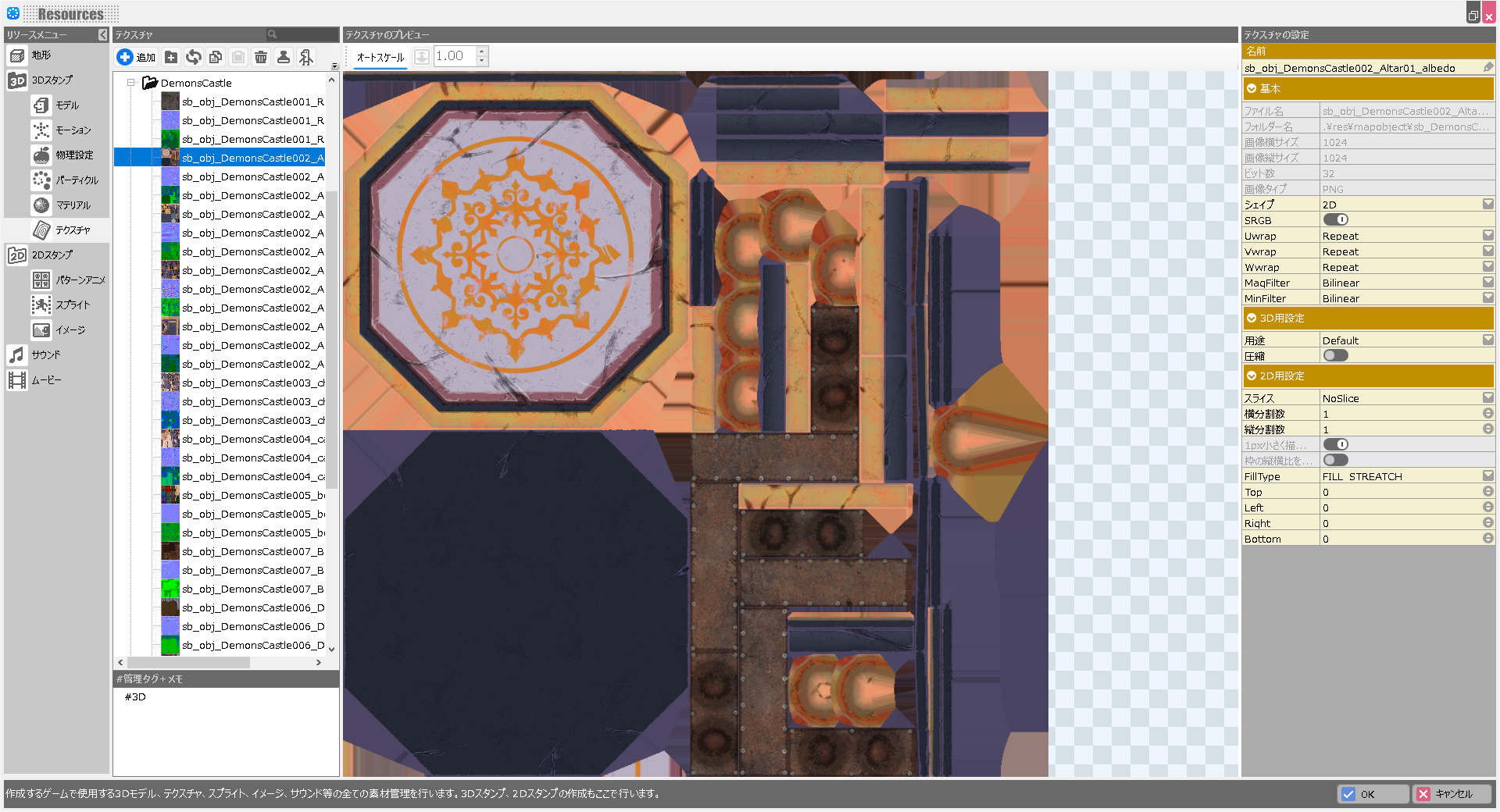 リソースメニューのテクスチャでは、テクスチャの詳細設定を行います。