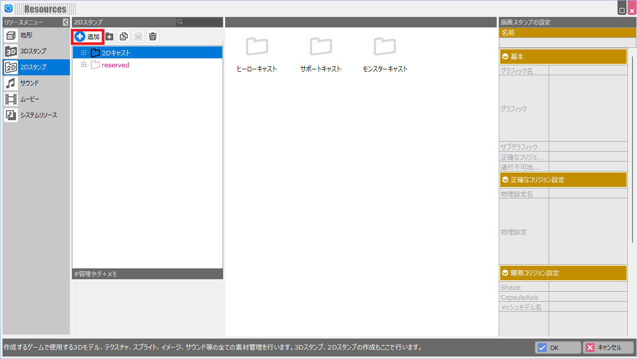 「リソース」にある「3Dスタンプ・2Dスタンプ」はBakinにおいてとても大事なものです。