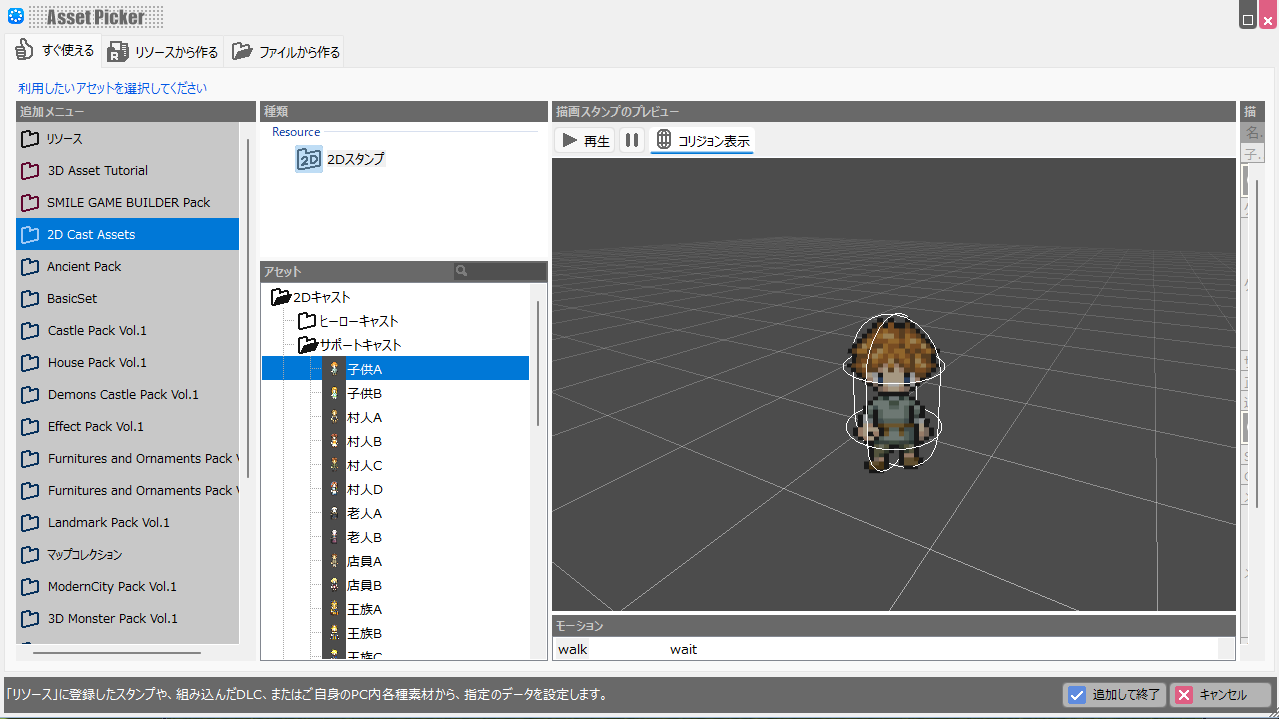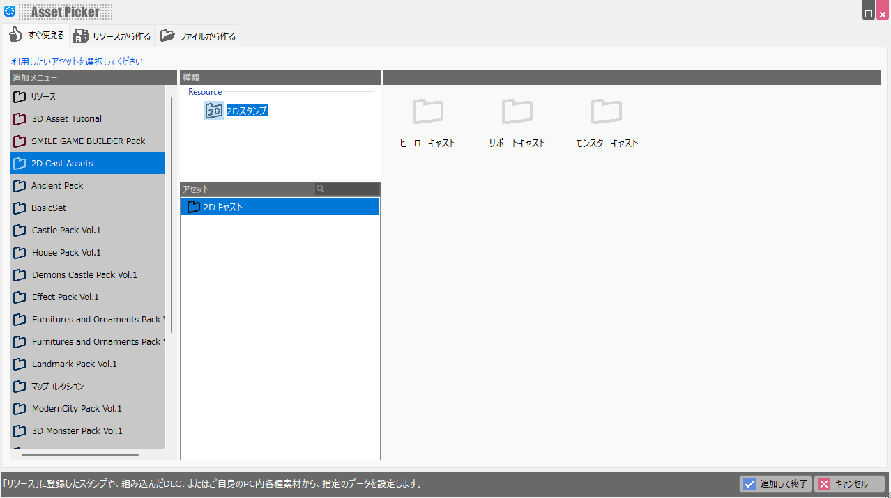 1.リソース > 2Dスタンプ にて追加ボタンを押すとAsset Pickerが開きます。