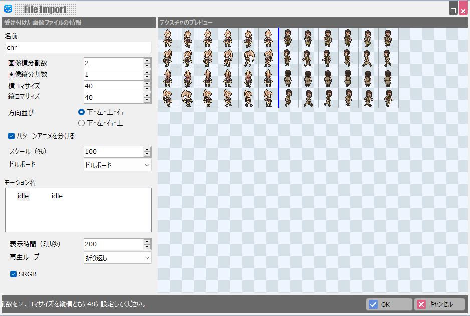 画像の向きがどの順番で並んでいるかを指定することで、Bakin用の並びに画像を自動変換して取り込みます。