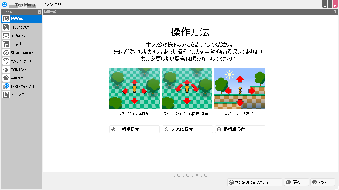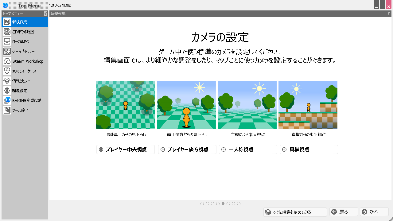 表示されている4種類のカメラ視点から、作りたいゲームのイメージに合ったものを選びましょう。