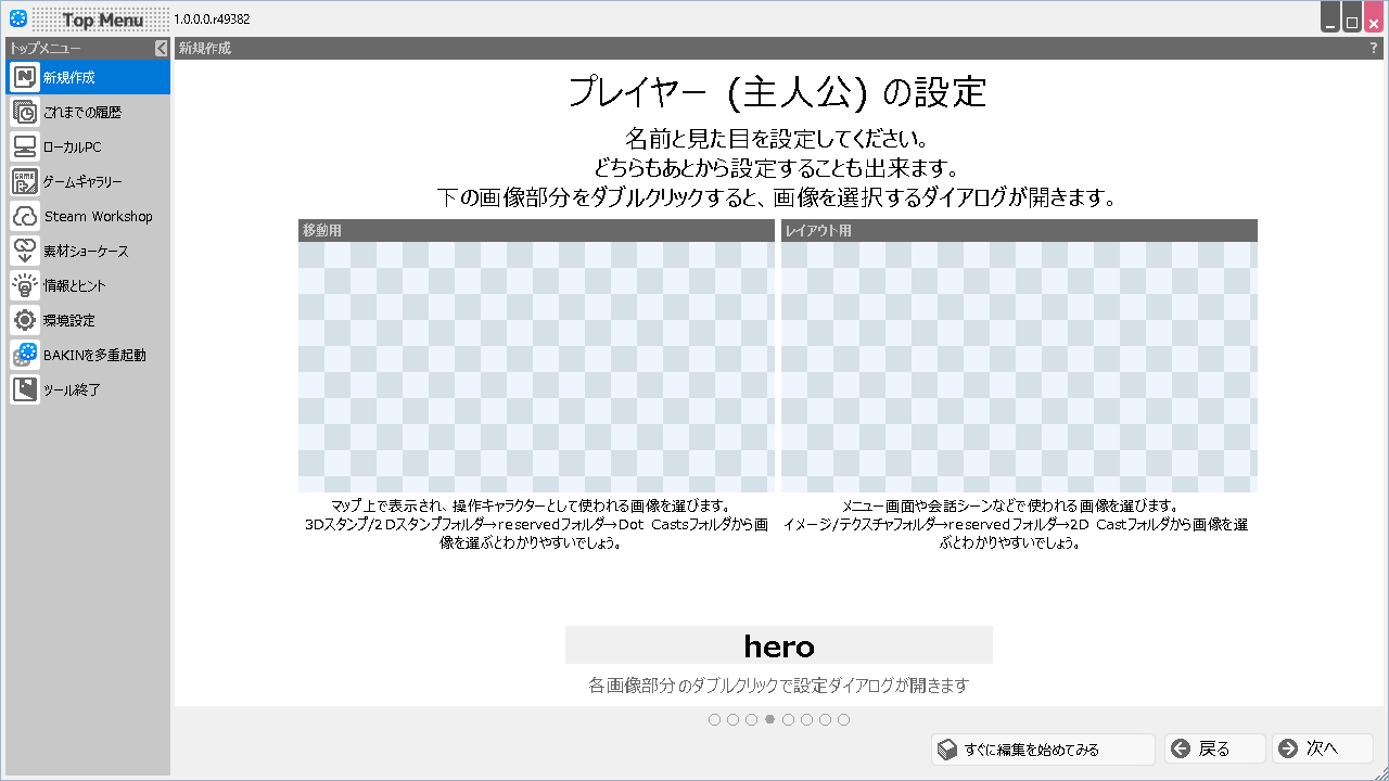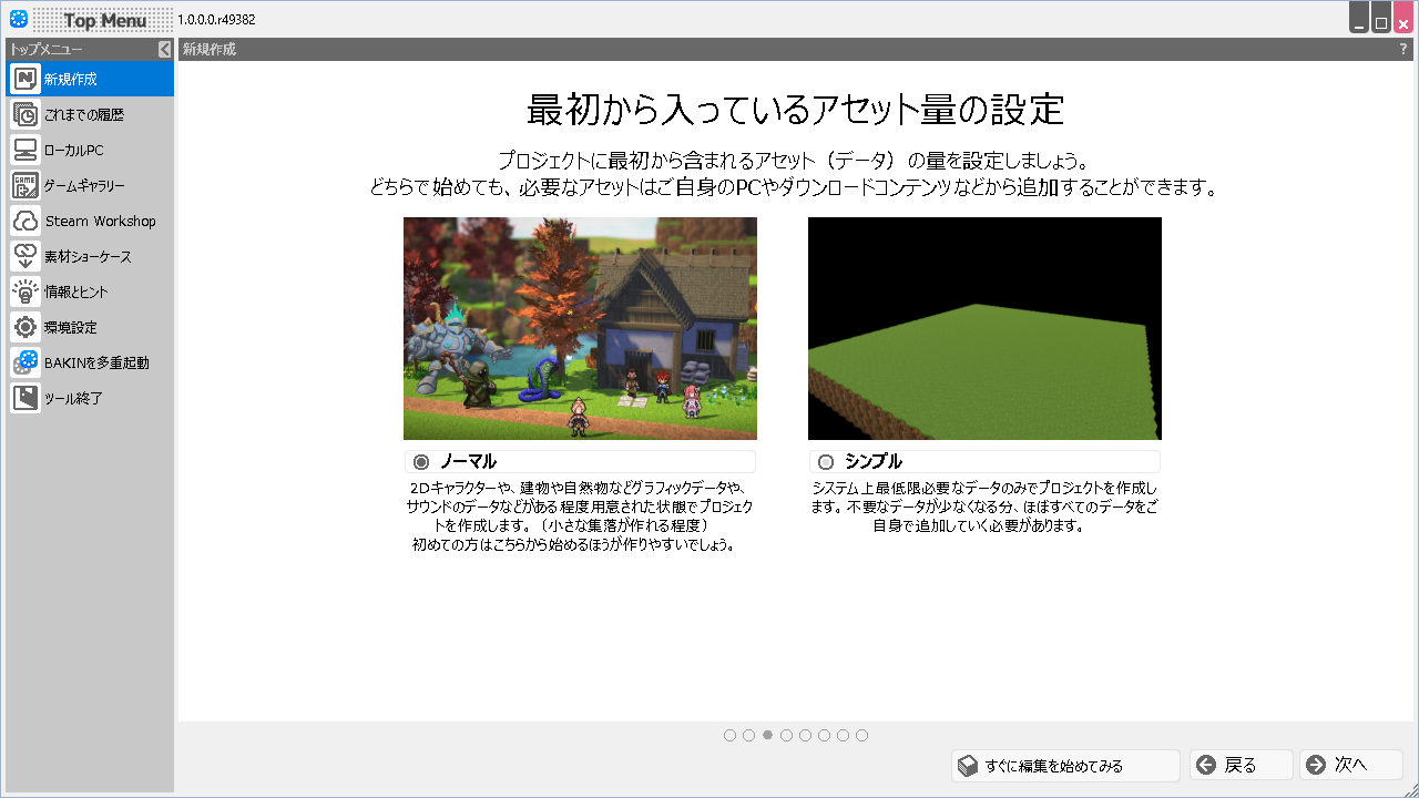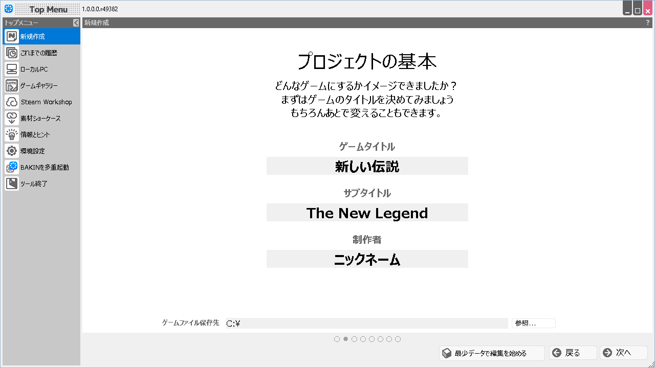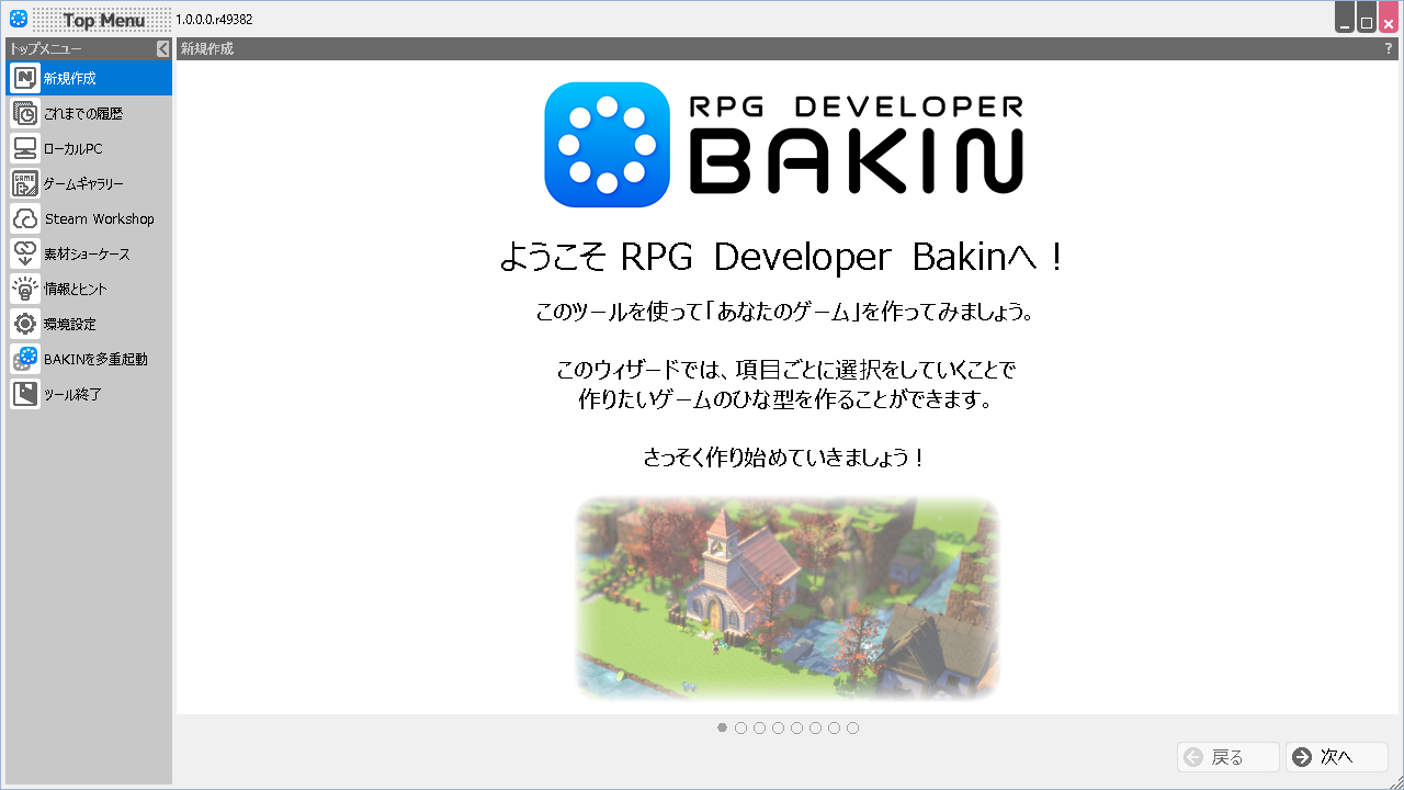 『RPG Developer Bakin』には、いくつかの項目を設定するだけで簡単にゲーム作成の入口まで案内してくれる「新規作成」が用意されています。