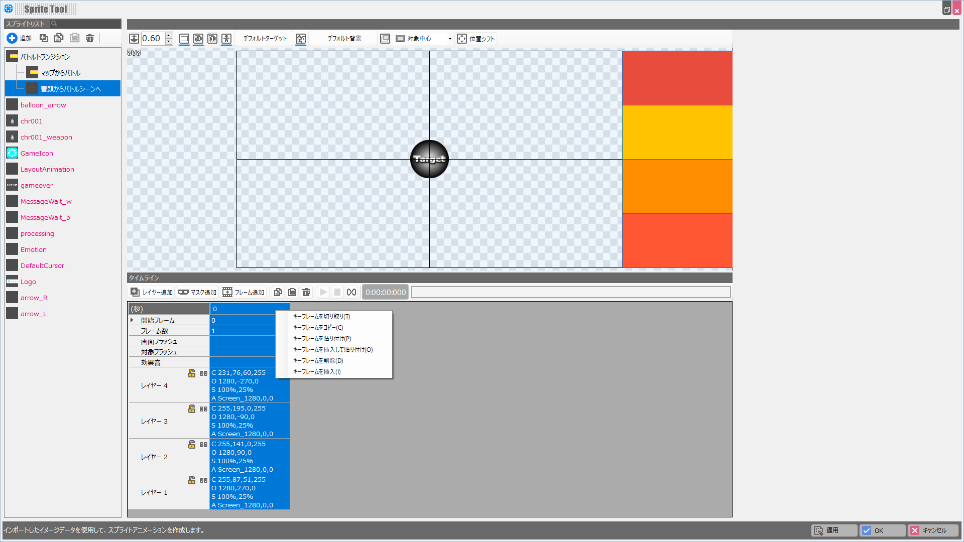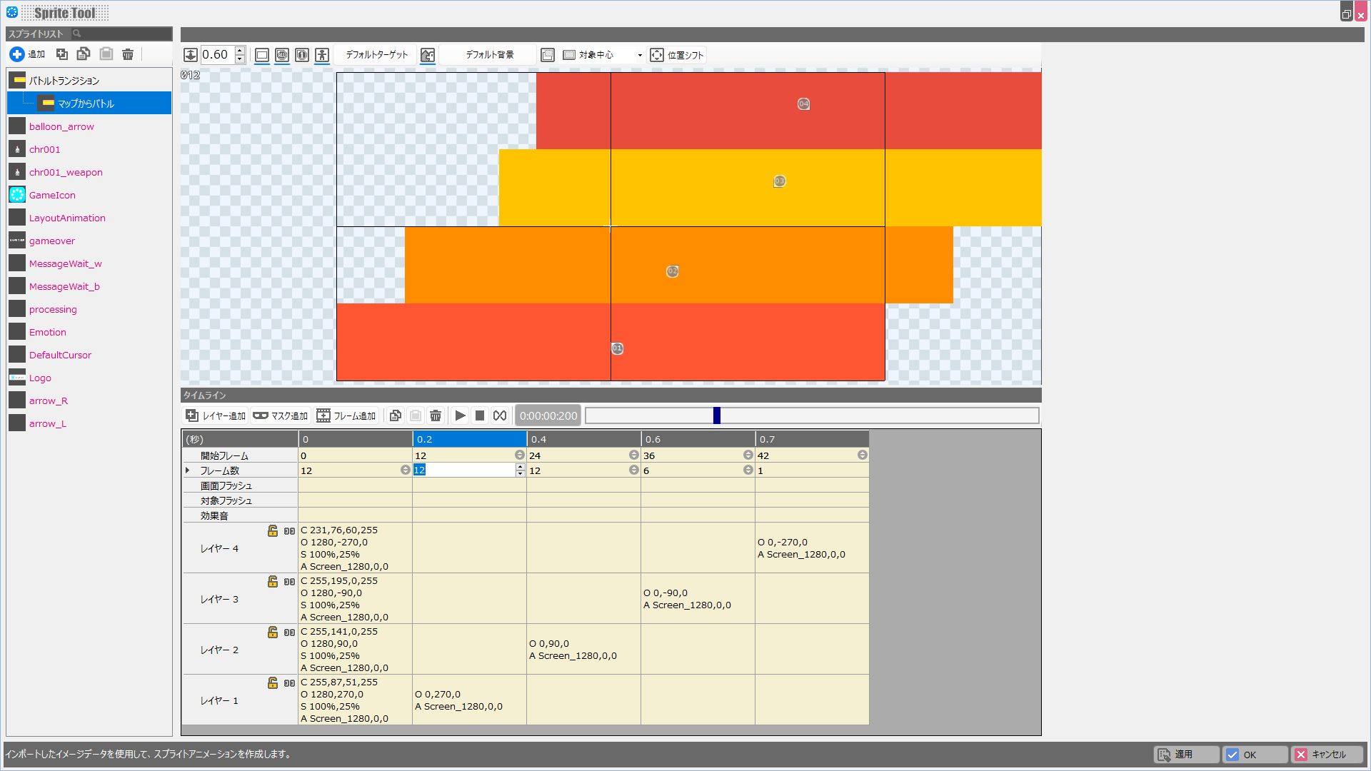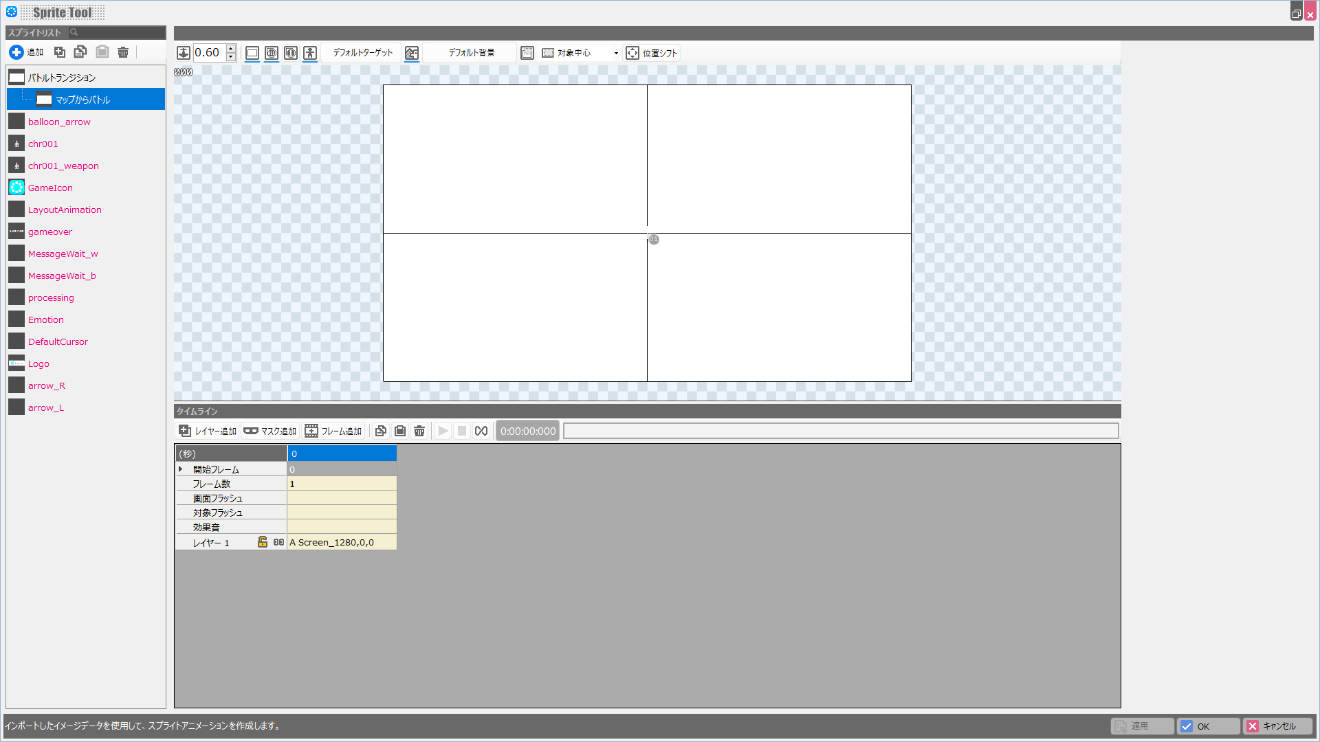 スプライトセットとモーションが作成されるので、スプライトセットの名前は「バトルトランジション」、モーション名は「マップからバトル」に変えておきましょう。