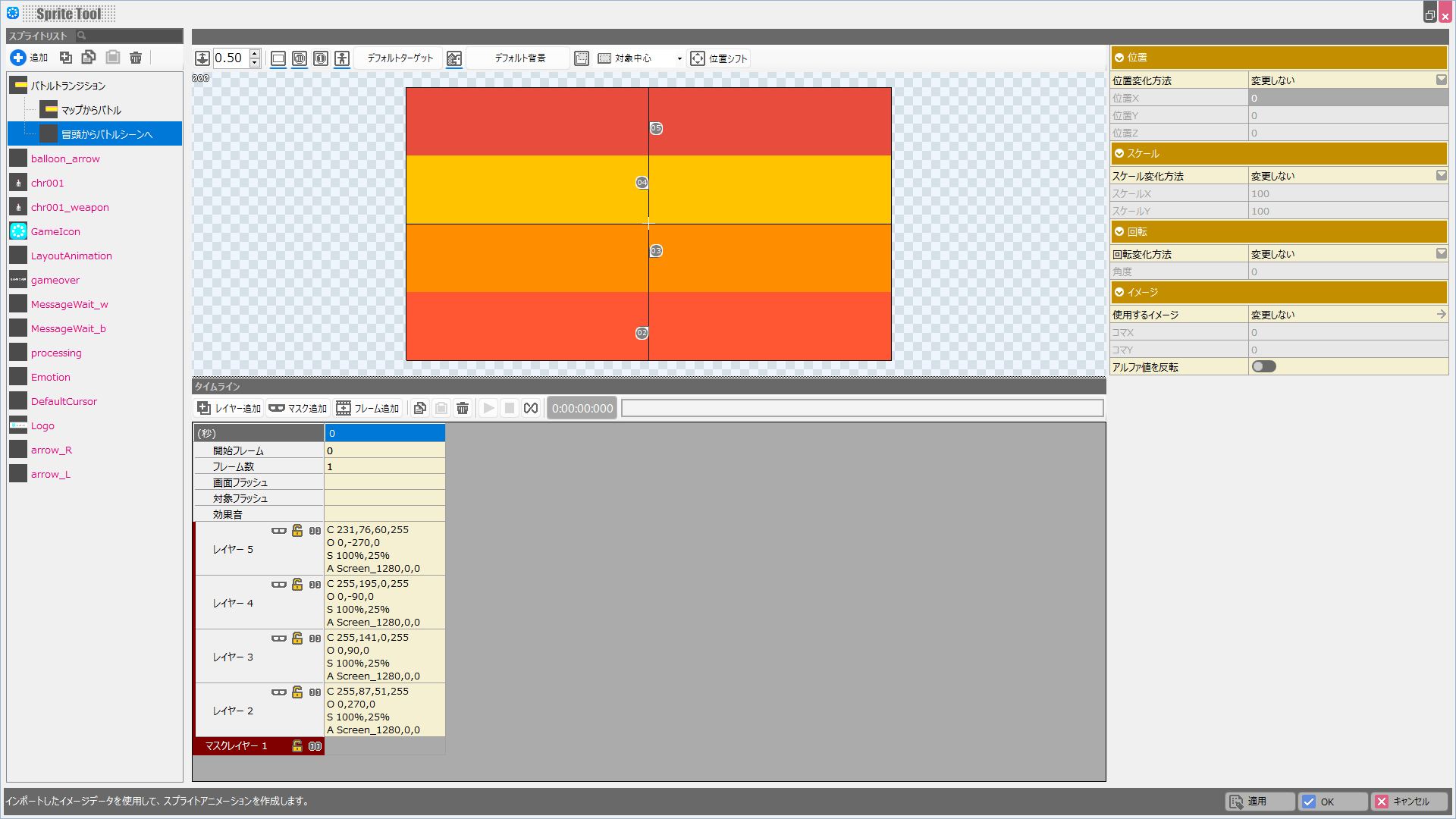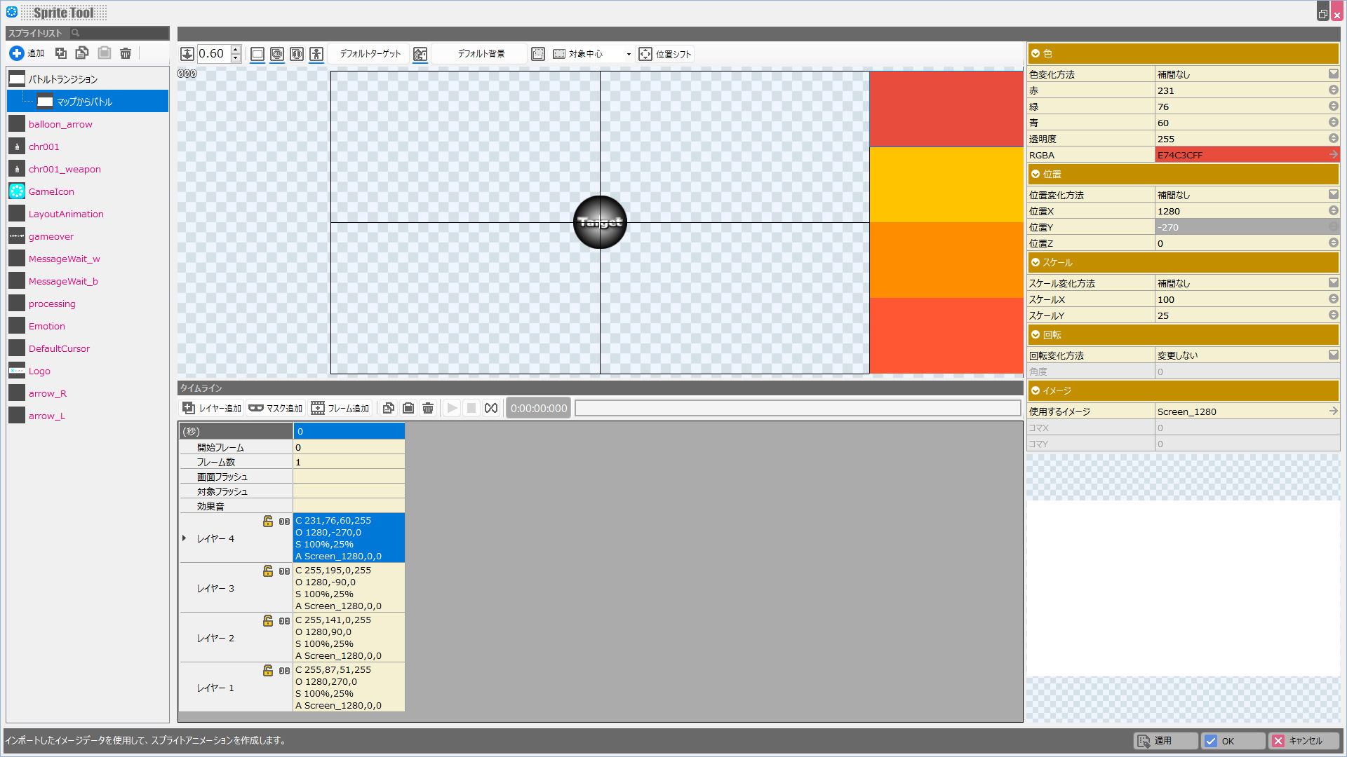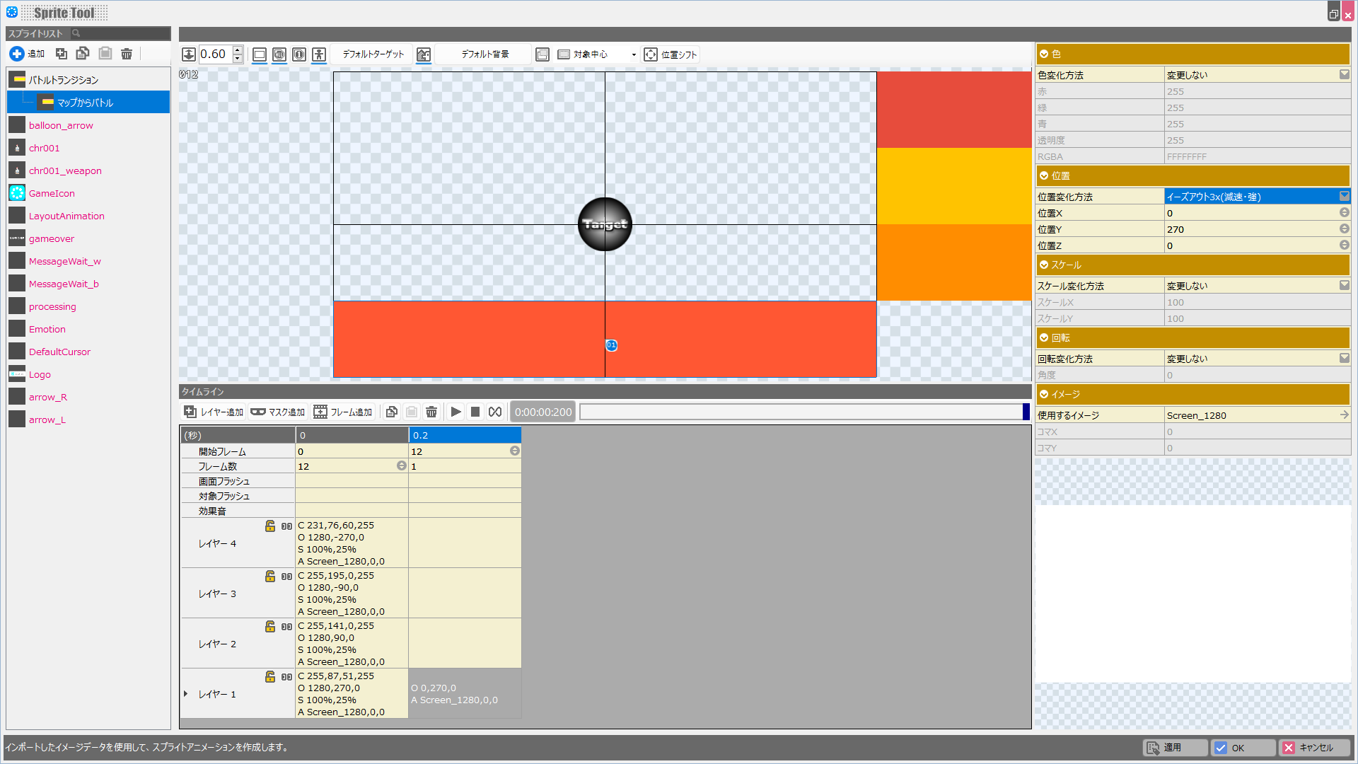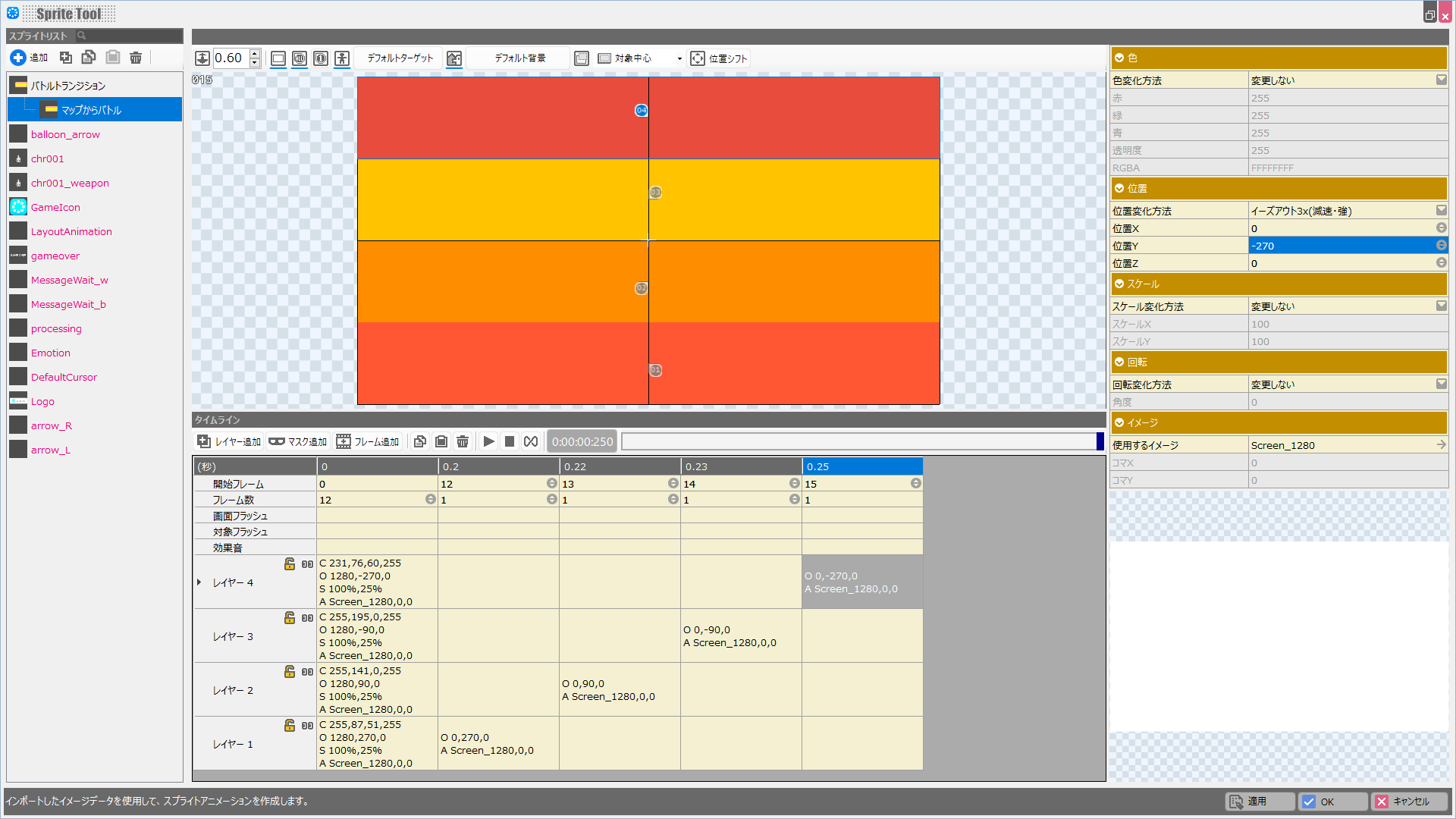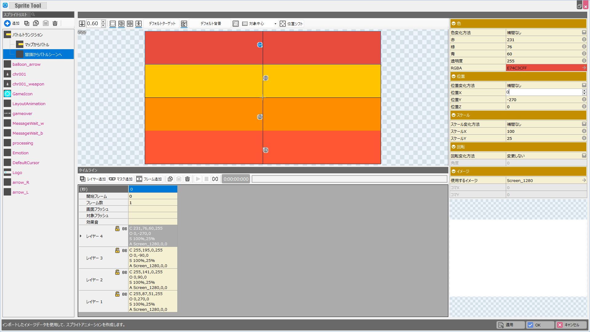 これで「バトルシーンの冒頭からバトルシーンへ遷移する際のスプライト」も完成しました。