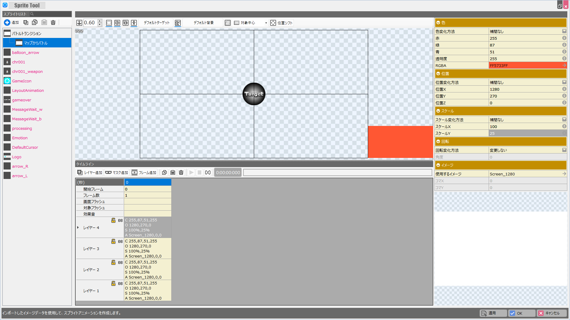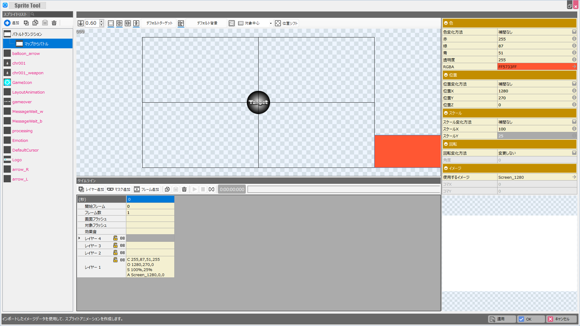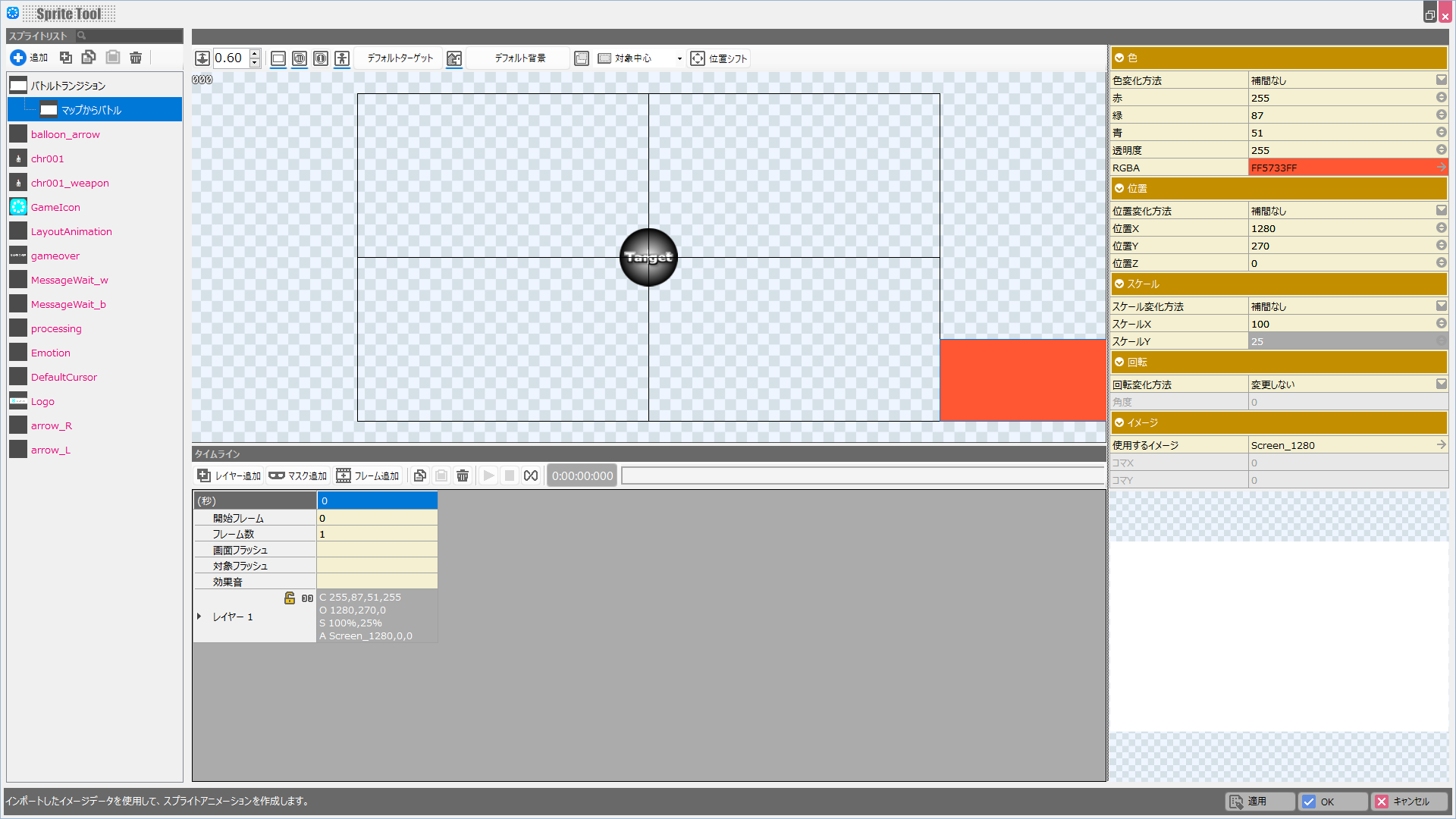 タイムラインにて、「画面フラッシュ」以下のセルを選択すると、スプライトツール右側に表示されます。